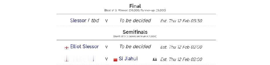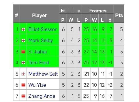 斯佳辉小组第三晋级半决赛! 2月12日,斯诺克冠军联赛胜者组小组循环赛战罢,斯佳辉三胜三负位居第三位。斯来塞、塞尔比位居前两名,汤姆福德位居第四。吴宜泽、张安达无缘小组四强。 半决赛对阵: 斯佳辉vs马克·塞尔比 斯来塞vs汤姆·福德