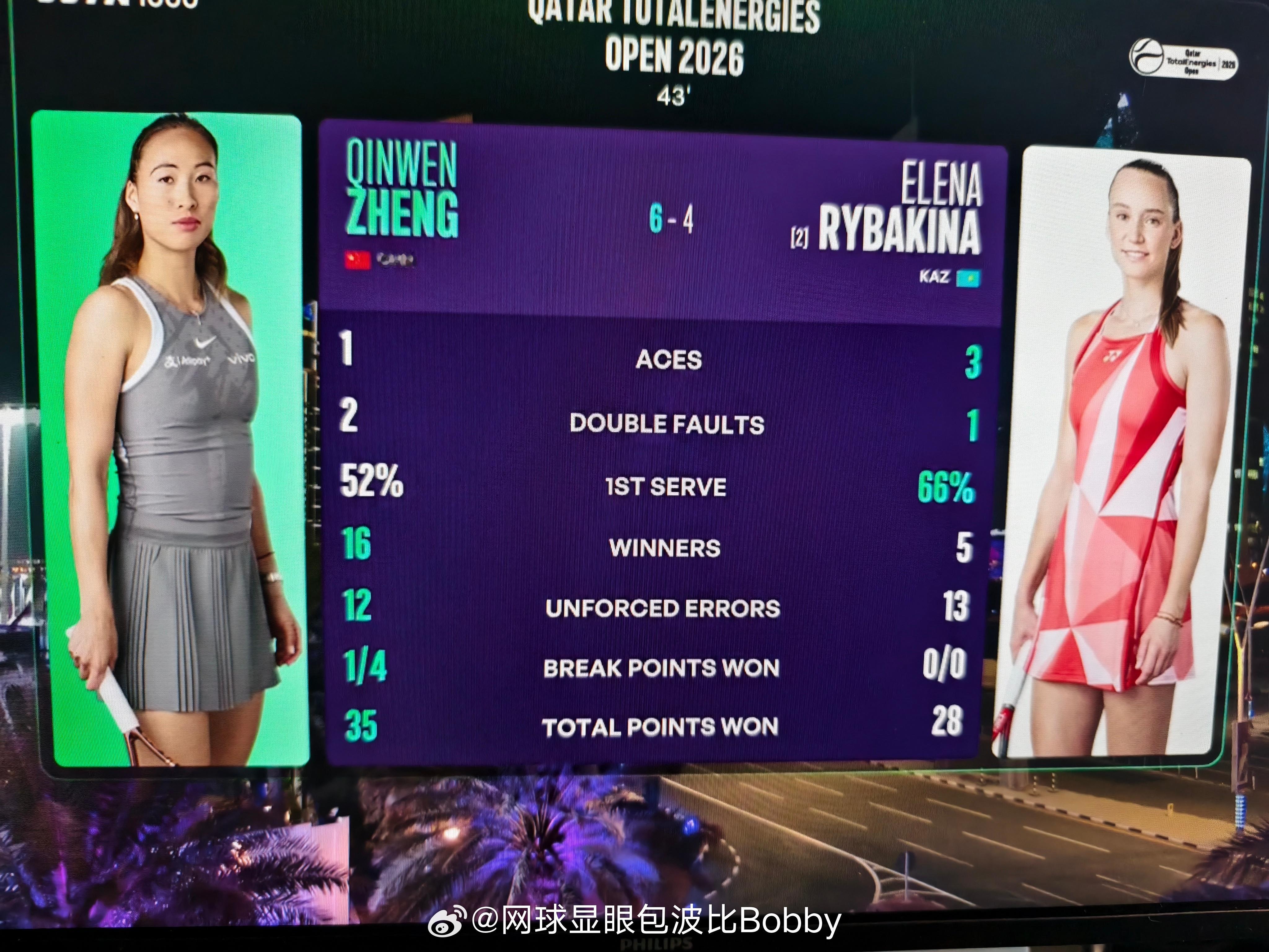 第一盘技术统计:郑钦文非常强势的打出16个制胜分,莱巴金娜只有5个,没有让莱巴金娜拿到一个破发点,感觉第一盘就是各种压着莱巴金娜在打。郑钦文的郑在进行时郑钦文vs莱巴金娜wta