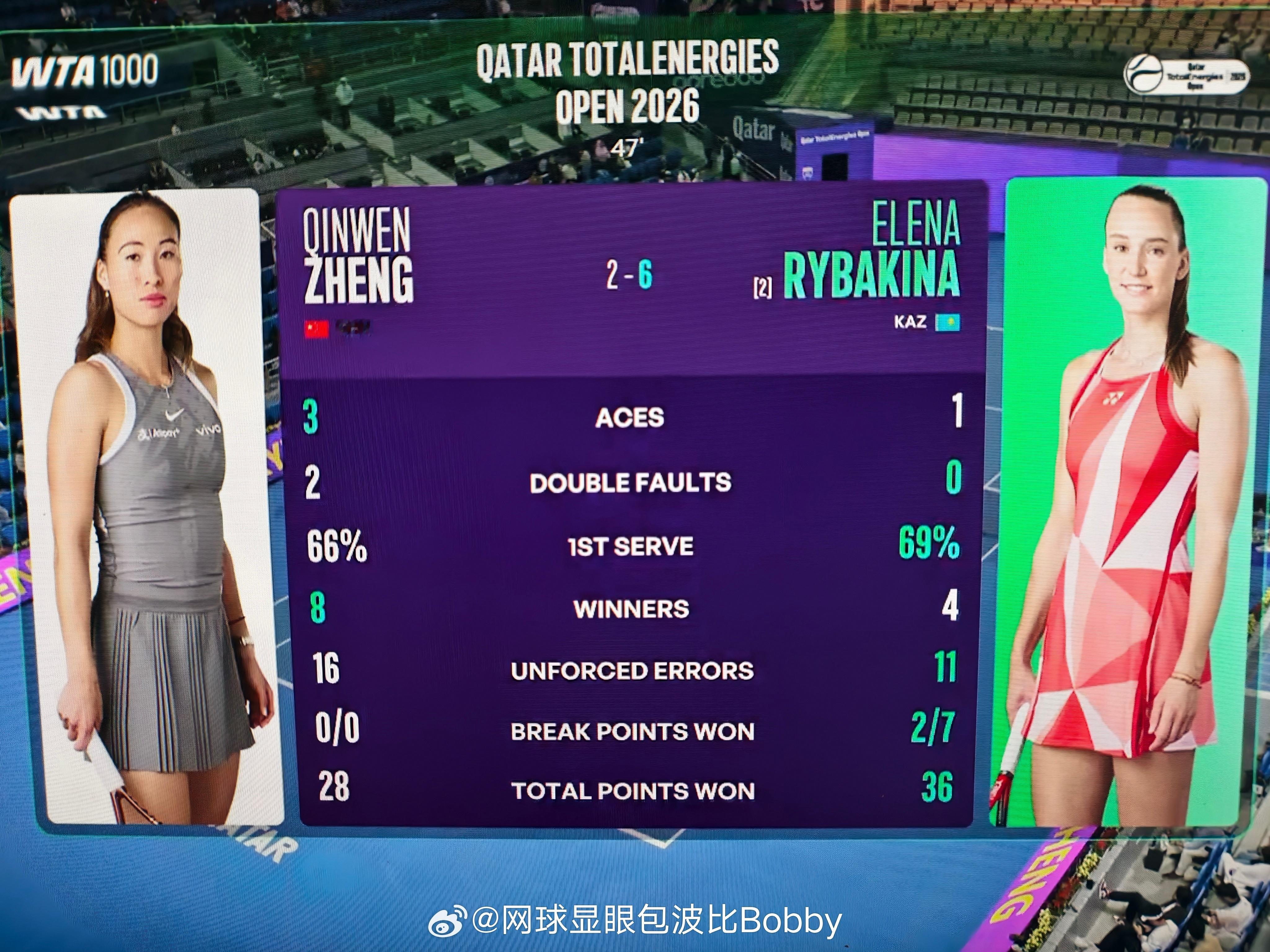 第二盘技术统计:郑钦文ue高达16个,而且没有拿到一个破发点