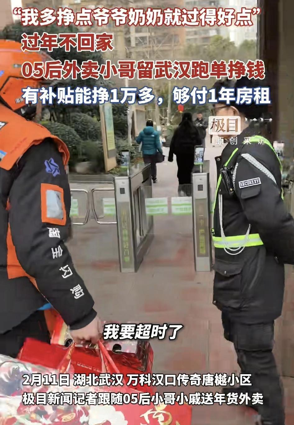 湖北武汉一位05后的外卖小哥匆匆忙忙进入小群里送外卖,因为马上要超时了,让保安大哥给他开门,他表示幸亏是小区开门比较方便,当被问到是否回家过年的时候,小哥说。过年留守在这里送外卖,可以挣到1万块钱,已经够我交一年的房租了,虽然很像家里的爷爷奶奶,但是自己挣的多才会给他们更好的生活。
