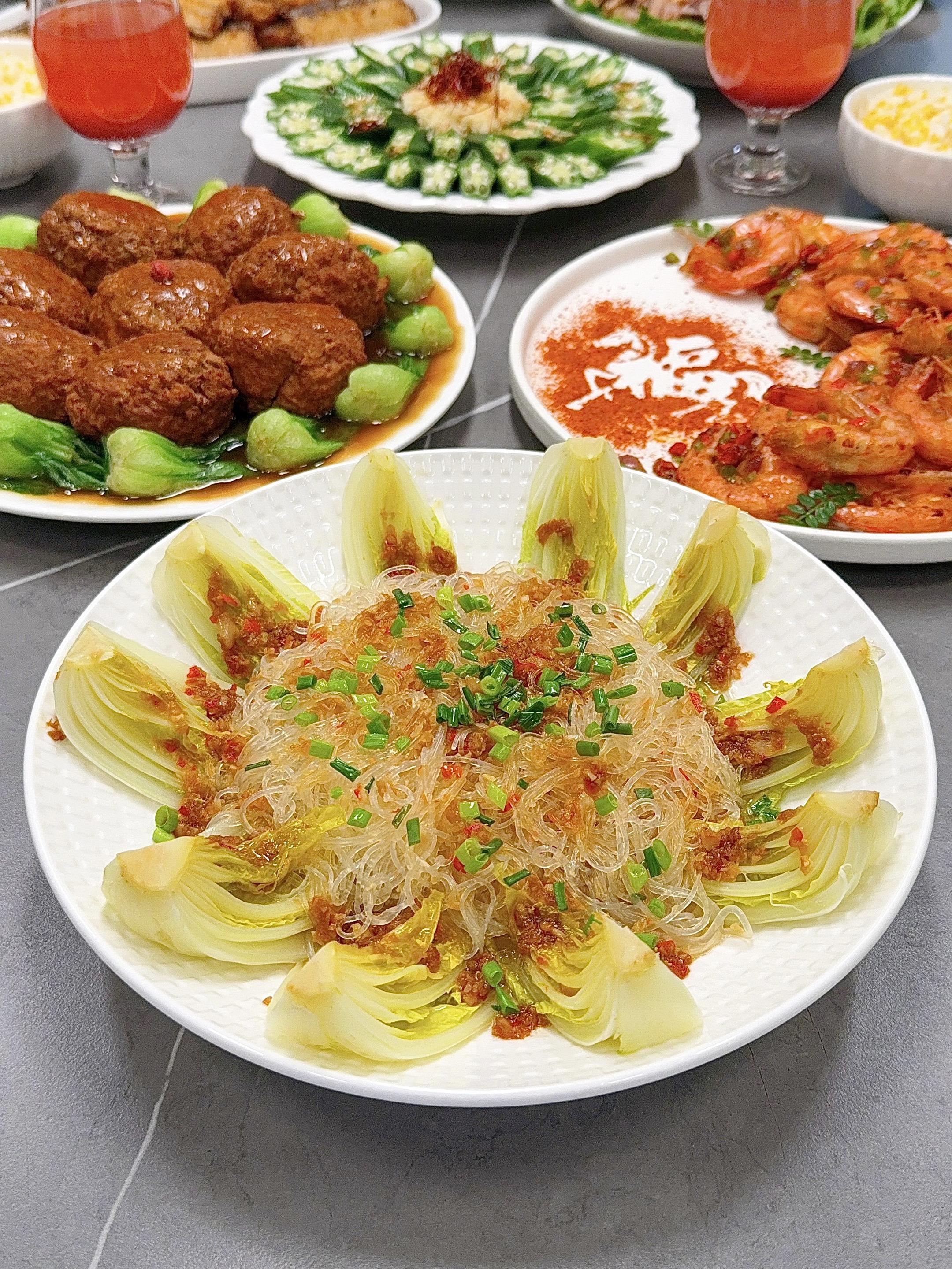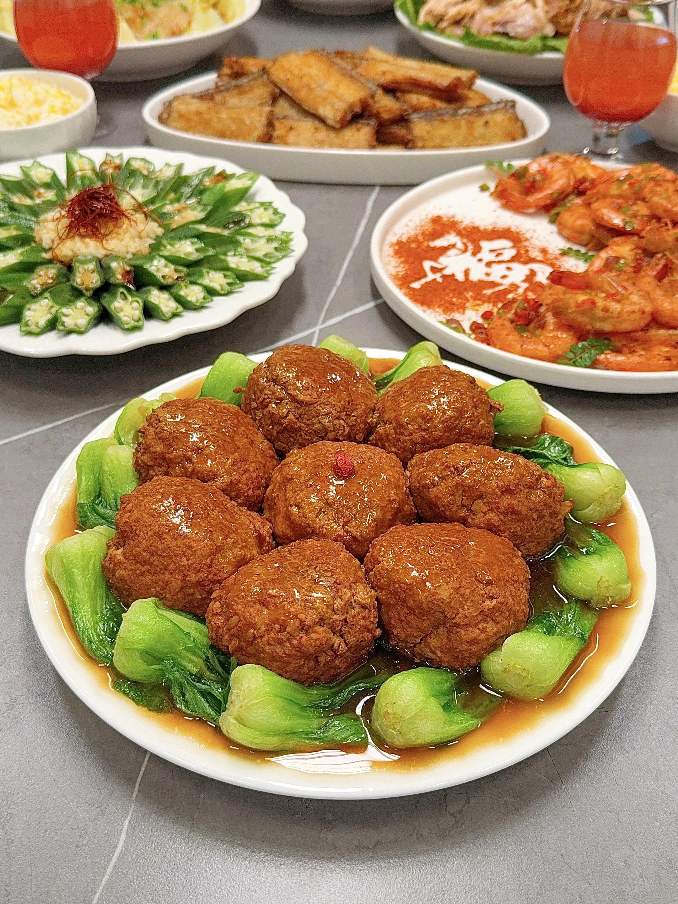 年夜饭灵感分享。年夜饭的仪式感,就藏在这一桌精心准备的饭菜里。今天给大家分享一桌我的家宴灵感,兼顾了经典硬菜和清爽风味,照着做,保证能让全家人都竖起大拇指!👍🏻👍🏻👍🏻 🧧新年家宴菜单分享: 🏮【红烧狮子头】 🏮【干炸带鱼】 🏮【椒盐虾】 🏮【蒜蓉粉丝娃娃菜】 🏮【手撕鸡】 🏮【白灼秋葵】 🏮【五彩水饺】 🏮水果:车厘子&草莓