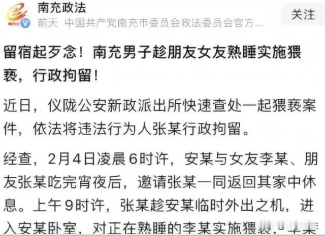 四川南充,一男子跟朋友聚会,在聚会上认识了朋友的女友,眼看对方女友长得很带劲,身材也很劲爆,当时男子内心就很蠢蠢欲动。酒席快要散去,男子的朋友则热情的邀请他一起回家,两个人还想要叙叙旧。跟着兄弟回家之后,兄弟接了电话外出办事,男子则悄悄潜入了兄弟女友的房间,伸手去偷摸女子。女子惊醒后很气愤,痛斥男子:做这事,你对得起他吗? 南充政法2月9日报道了这则新闻。 据报道称,被兄弟的女友斥责之后,男子很羞愧,还想要辩解的时候,女友直接拿起手机报了警。 一男子安某有个好兄弟张某,两个人好久没聚了,得知最近好兄弟张某来到了自己的城市,安某就想着喊上张某一起吃个饭。 在饭局上,安某携带了自己的女友李某一起,三个人喝的非常开心。 聚会上,其实有个小细节,那就是张某一直悄悄的注意着好兄弟的女友李某,对方长得是很带劲,身材劲爆,长相也很好看。 张某当时还心想:安某可真是好福气啊,他怎么就能谈到这么漂亮的女友呢。 饭局快要结束了,眼看就要分开,张某内心还有点小遗憾。倒不是因为跟好朋友分别,他才感到有些忧伤,而是,快要离开好兄弟的女友了,他有些怏怏不乐。 谁知道,这个时候安某竟然主动提出:“今天也很晚了,你就就别回去了,到我家睡一晚,咱哥俩还可以再聊一聊。” 听到这话,张某欣然答应,内心很开心。 之后三个人就回到了安某租住的小区,一阵闲聊之后,女友李某就准备洗漱睡觉了。 李某是一个人睡在卧室里的,而安某就跟自己的好兄弟张某,两个人在客厅里打地铺。 夜色渐深,安某突然接了个电话,说要出去一趟。安某就跟好兄弟说,马上就回来。 而张某眼看着机会来了,他就悄悄的打开了李某的房间。 此刻,房间内的李某睡得正香,丝毫没有注意到有人潜入自己的房间。而这个时候的张某,实在是忍不住了,毕竟睡梦中的李某,也是水灵灵的、可爱的很。 他靠近了床边,开始对李某实施猥亵。 张某把手伸进了李某的被窝,开始用手触碰李某的身体,之后就在她的身上一阵抚摸。 可能按揉的力度有些大,动静声将李某给惊醒了。 李某睁开眼睛,眼前出现张某的脸,细想刚刚他的手,竟然伸了进来,李某非常气愤,直接就当面斥责:“你这样做,对得起他吗?他可是你从小玩到大的好兄弟!” 而这个时候,张某一直在辩解,甚至还想要跑回客厅里,试图要逃走。 李某则快速的拿起手机,直接就报了警。 接警之后,办案人员也快速来到了现场,并且将躲在客厅的张某给控制住了。经过审讯,张某也对自己的行为如实供述。 张某表示:“对方太迷人了,自己一时鬼迷心窍,感到很对不起她,也对不住自己的兄弟。” 目前,张某涉嫌猥亵罪,已经被带回调查、作出行政拘留处理。 本案释法: 男子趁好兄弟不在家,对兄弟的女友实施猥亵的行为,此举是否构成违法呢? 根据《刑法》第二百三十七条规定,以暴力、胁迫或者其他方式做出强制猥亵的行为,或者涉嫌侮辱妇女的,则构成猥亵罪。 正常来说,构成此罪会被处以五年以下有期徒刑或者拘役。 在本案中,事后张某积极认罪,并且取得了朋友的谅解,最后的处理方式就是先采取行政拘留。但是这并不意味着他可以免责。之后如果证据充分、情节严重,就会转入刑事程序。 像张某这类案件,就是属于熟人作案,趁人不注意潜入房间里,对女子实施猥亵行为,不仅违法,往往还被认为是背信弃义,这类主观恶行更加深重,反而可能会从重处罚。 为什么总有人感觉,只是猥亵,还没有发生那个关系,这个事儿就不算大? 先是触摸,谁知道之后男子还要做什么呢? 也有人认为,连兄弟的女友都不放过,这样的人,不配得到爱情,也不配拥有友情! 而女友李某做的也很对,不要隐忍、不要纵容,遇到这样的事情,果断打电话报一下案,不然,下次还会有类似的事情发生。 对于此事,您怎么看待呢?不妨评论区留言,大家一起来讨论吧!