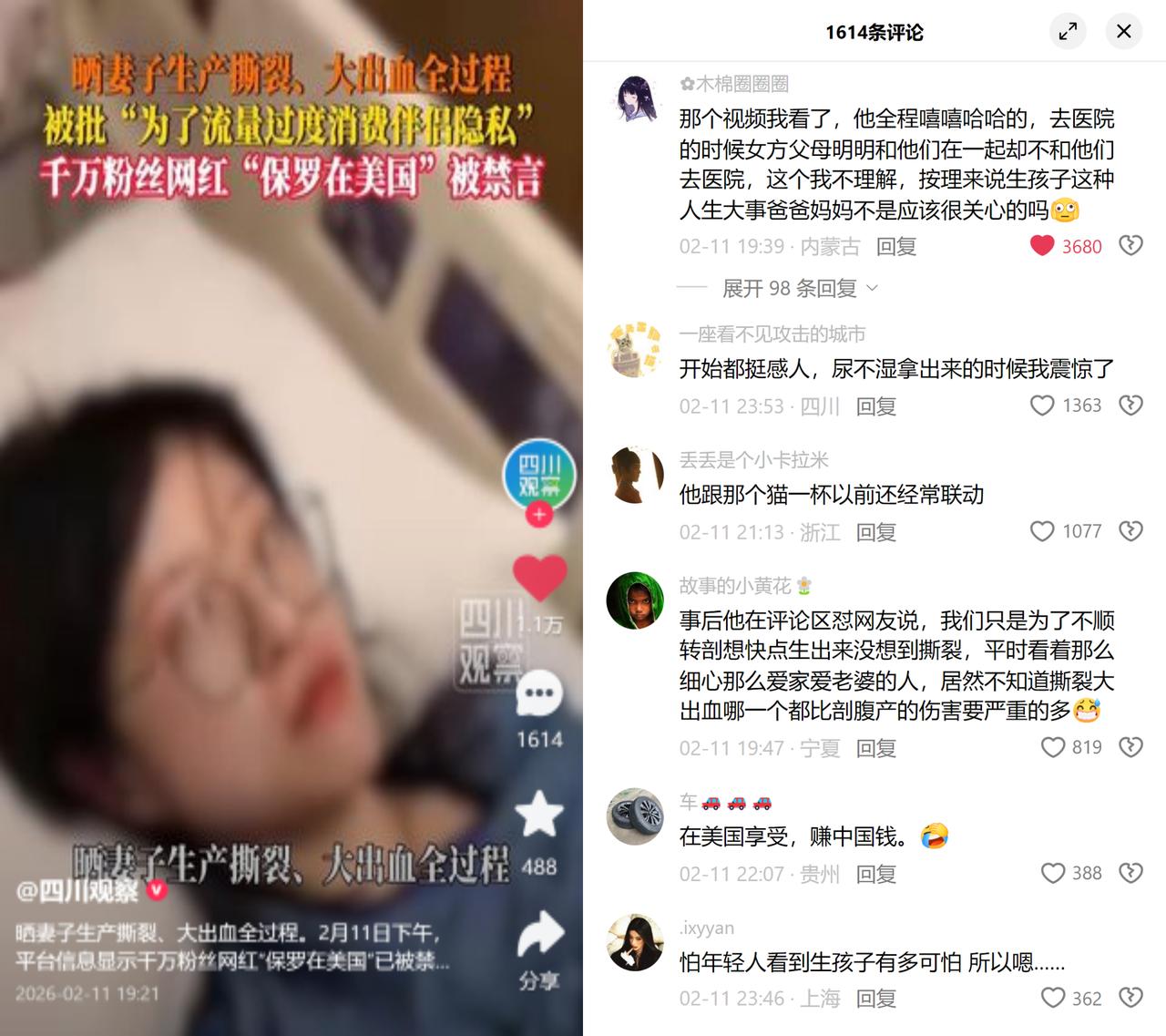千万粉博主拍妻大出血带货被禁言 某千万粉博主全程记录妻子生产大出血,称其失血3000多毫升,抢救时还不忘植入尿不湿广告,结果账号被全平台禁言。 3000毫升是成年人全身血量的六成,搁医学上这是要命的极重度失血,正常家属早吓得魂都没了,他倒好,全程能冷静拍视频还嘻嘻哈哈。 大家都在说他岳父母当天都在,却没跟着去医院,这操作本身就透着诡异。再想想他和争议博主的过往联动,对流量的执念早超过底线了吧? 说什么科普女性生产不易,真为老婆着想,应该抱着她哭到发抖,哪有心思举着镜头盘算这条视频能涨多少粉、带多少货? 把伴侣的生死时刻当流量密码,把私密痛苦变现成生意,这种流量至上碾压人性温度的荒诞剧,被禁完全是咎由自取!