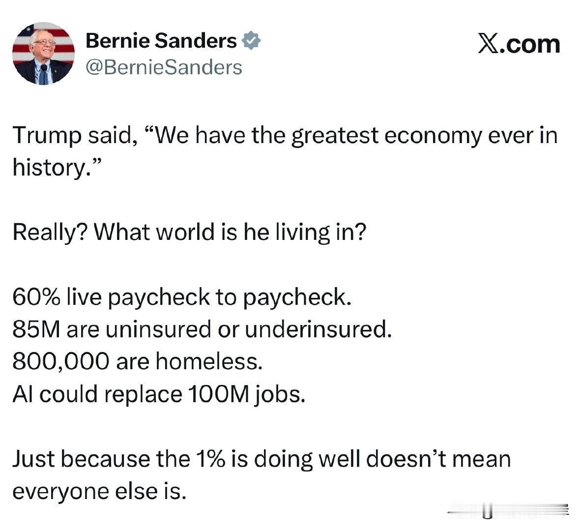 Bernie Sanders发文反驳川普。 “川普说:'我们拥有历史上最伟大的经济。' 真的吗?他活在哪个世界里? - 60%的人靠工资勉强维持生计 - 8500万人没有保险或保险不足 - 80万人无家可归 - 人工智能可能取代1亿个工作岗位 仅仅因为1%的人过得好,并不意味着其他人也过得好。”