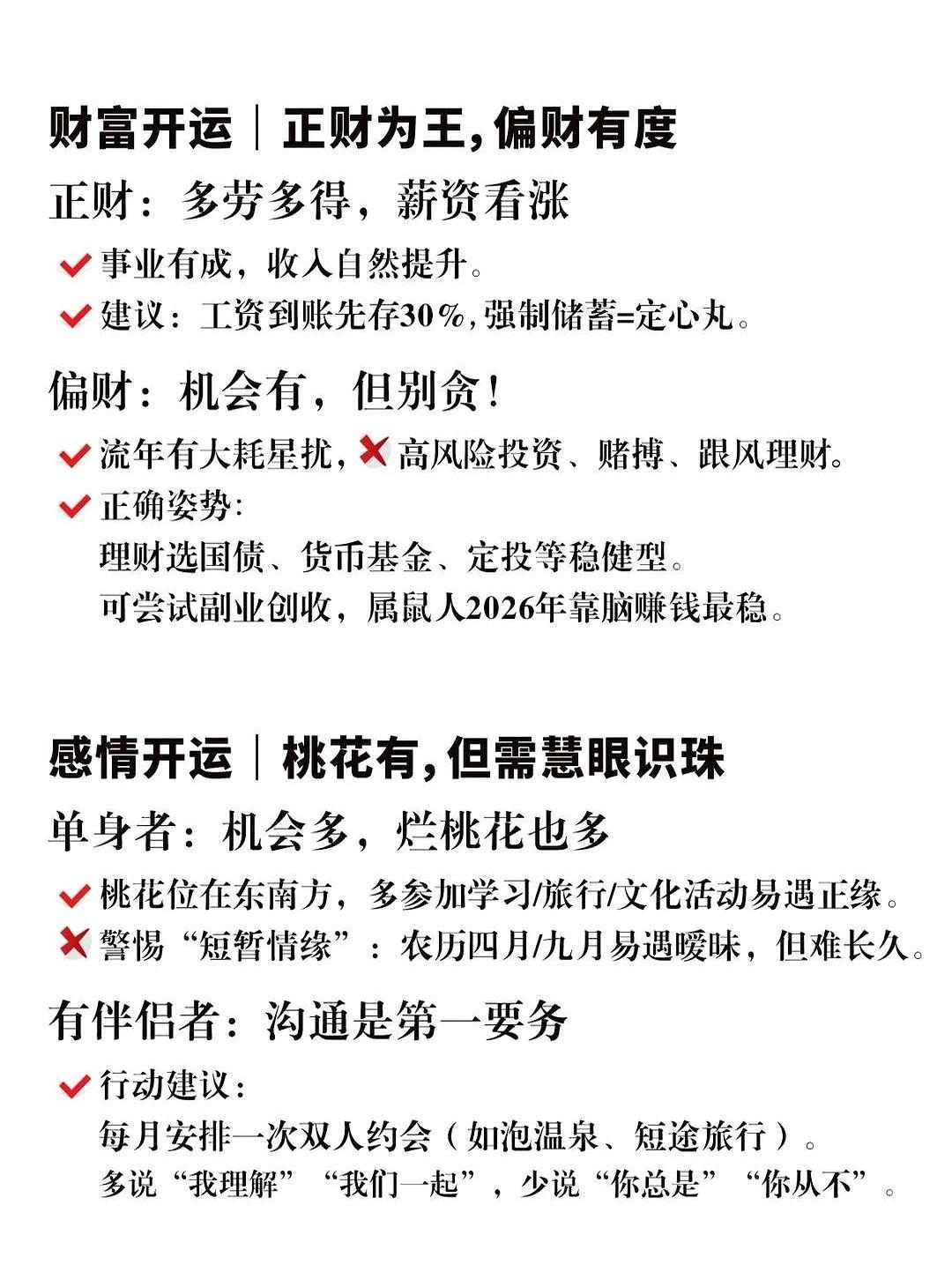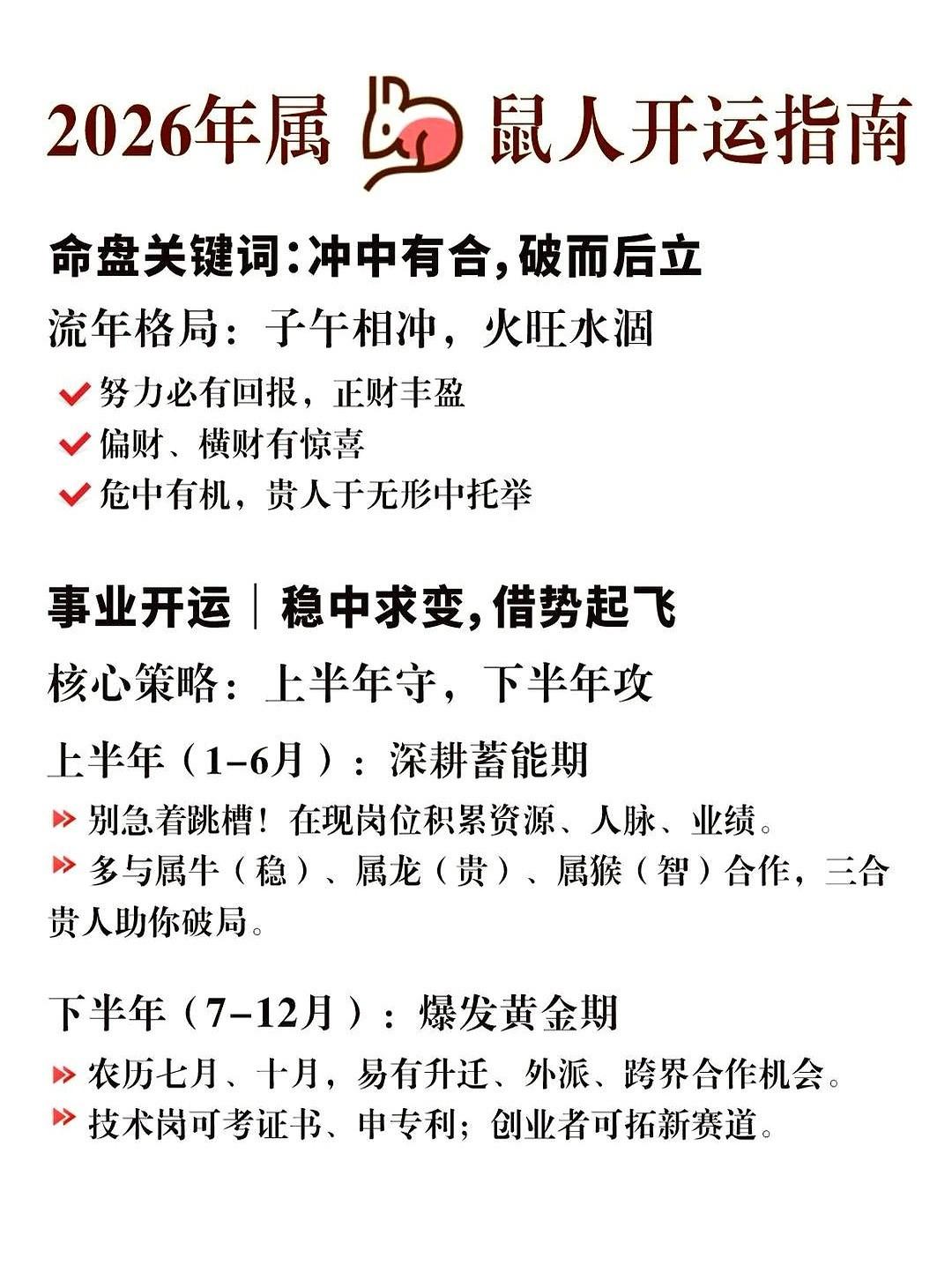 2026年,属鼠的要留神了。 上半年,你会感觉像被一只无形的手死死按住。不是你不行,是那股劲儿不对了。身边最熟的同事,突然开始话里带刺。手里的项目,临门一脚就是签不下来。钱明明没乱花,账单却像雪花一样飘过来,堵得你喘不过气。 岗位说调就调,行李箱刚收好,通知又来了。这时候别跟人拍桌子,没用。把合同、聊天记录,所有带字儿的东西都备份好,这比吵赢一架管用一百倍。 直到秋风吹起第一个晚上,你走在下班路上,突然感觉肩膀一松,好像一直压着你的那块石头,自己滚开了——那种憋了大半年的闷气,终于长长地吐了出来。 运,转过来了。 帮你的人出现了,很可能就是属牛、属龙、或者属猴的。之前那些死结,自己就解开了。这时候,再谈跳槽,再推新项目,你会发现,路都给你铺好了。 记住,这一年别碰任何听起来“赚大钱”的东西,朋友拉你入伙的也别信。你的钱,只配放在银行卡里睡大觉。 回家就把工作那张臭脸收起来。另一半说句话让你不舒服,先别急着怼回去,心里默数三个数。那点破事,不值得你们俩冷战三天。单身的也别急,上半年那些热闹都是来消耗你的,下半年那个对的人,才会在路口等你。 所以你看,2026年对属鼠的来说,根本不是倒霉。它就是一场强制系统重装,先把所有碍事的玩意儿全给你清了,再让你轻装上阵。 说真的,事业、钱、还是感情,你最想先清哪个“缓存”?