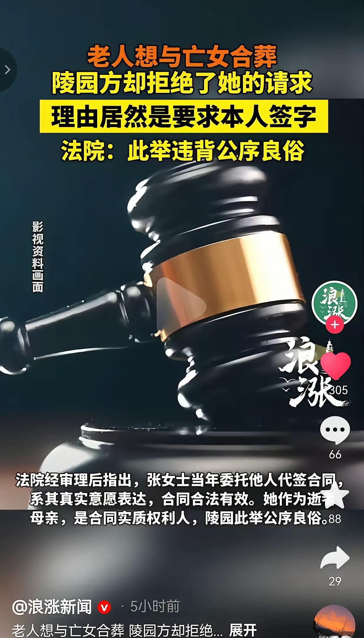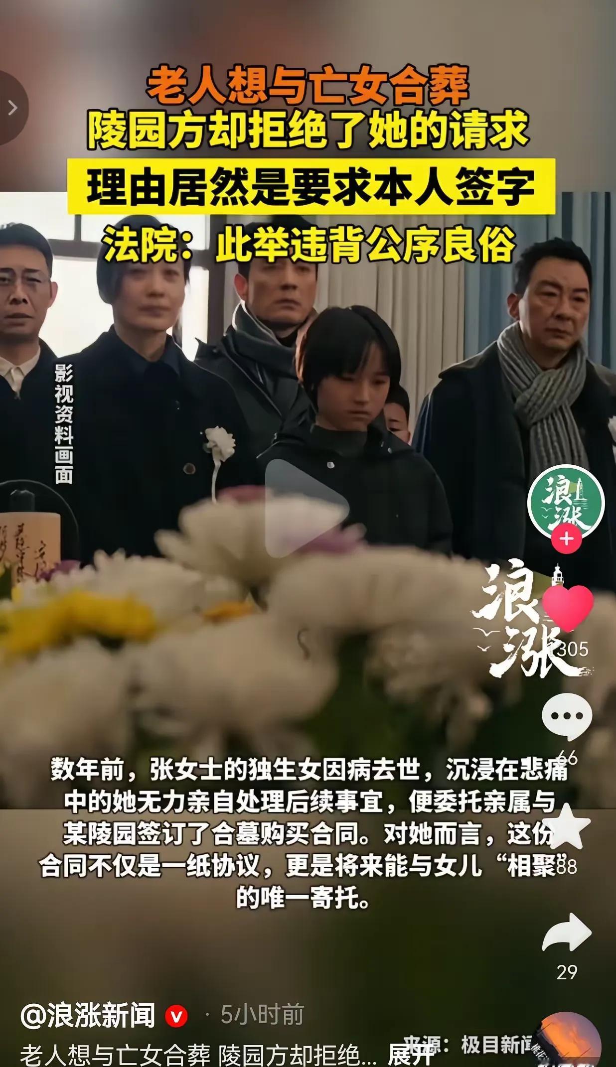 离大谱了!老人想与亡女合葬却遭到了陵园的拒绝,陵园方给出的理由要本人签字?老人无可奈何,只好一纸诉状起诉至法院,法院判了:违公序良俗! 张婆婆(化名)是个苦命人,几年前独生女因病去世,她当时悲痛得几乎垮掉,连处理后事的力气都没有,只能委托亲戚去陵园签了一份合墓合同。在她心里,这合同哪里是纸啊,那是她往后余生唯一的念想——等自己走了,就能和女儿在另一个世界“团聚”,再也不用孤零零的了。 可谁能想到,等她真的要实现这个心愿时,陵园却把门关得死死的。工作人员说,当年的合同不是她本人签的,现在要合葬,必须得“本人签字”才行。这话听着就离谱,她女儿都已经走了这么多年,怎么可能再出来签字?张婆婆瘫在床上,连下床都费劲,更别说去跟陵园掰扯这些歪理了。她哭着求了一次又一次,得到的只有冷冰冰的拒绝。 这哪里是在按规矩办事,分明是在拿冰冷的条款往人心窝子上扎。合葬的心愿,对张婆婆来说,是对女儿最深沉的爱,是支撑她活下去的精神支柱。可陵园却用一个根本不可能实现的要求,硬生生把这份念想掐灭了。他们只看到了合同上的“签字”二字,却看不到一个母亲对女儿的牵挂,看不到这份合同背后承载的全部情感重量。 更让人寒心的是,这种“死抠条款”的做法,在现实中并不少见。有些机构总爱把“规定”挂在嘴边,却忘了规定的初衷是为了更好地服务人,而不是变成刁难人的工具。当规则失去了温度,变成了冷冰冰的枷锁,那它就不再是保护人的底线,而是伤害人的利刃。 好在法院的判决给了张婆婆一个公道。法院明确指出,当年的代签是她真实意愿的表达,合同合法有效,她作为逝者母亲,是合同的实质权利人,陵园的做法违背了公序良俗。这一纸判决,不仅维护了张婆婆的合法权益,更守住了人心的底线,告诉我们:在情感和人性面前,那些僵化的、不近人情的规则,终究要让位于公序良俗。 这件事也给我们提了个醒:当我们在制定和执行规则的时候,是不是应该多想一想“人”的处境?是不是应该多给情感和人性留一点空间?毕竟,规则是死的,但人是活的。如果连一个母亲想和女儿合葬的心愿都要被无情驳回,那我们的社会,又何来温度可言? 各位读者你们怎么看?欢迎在评论区讨论。