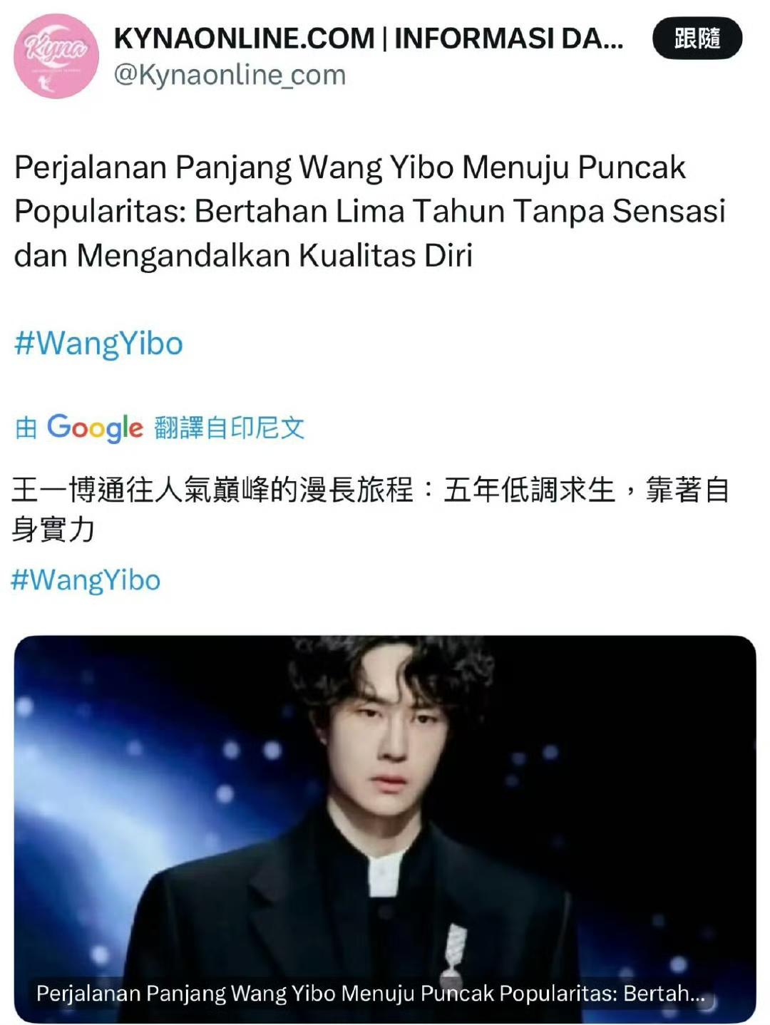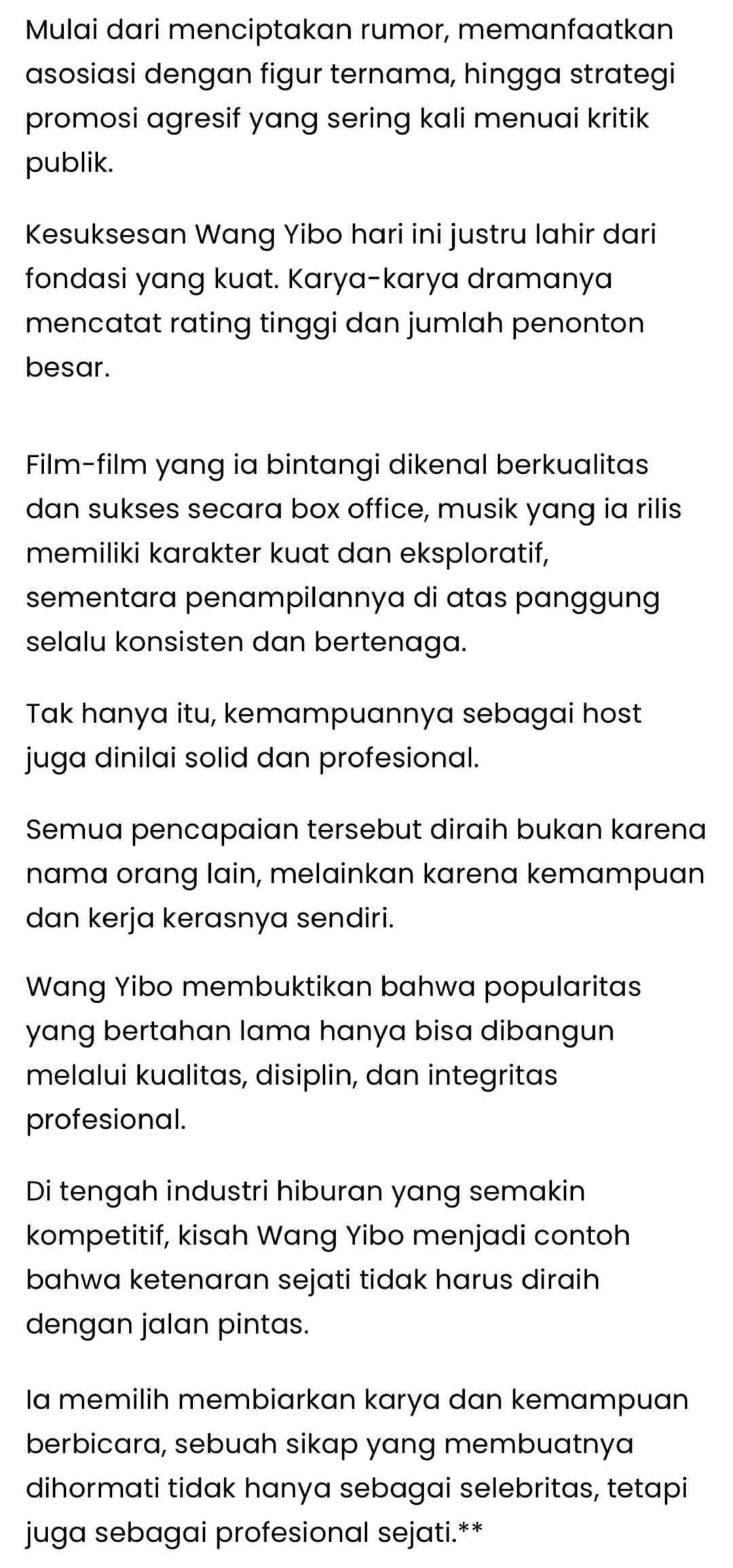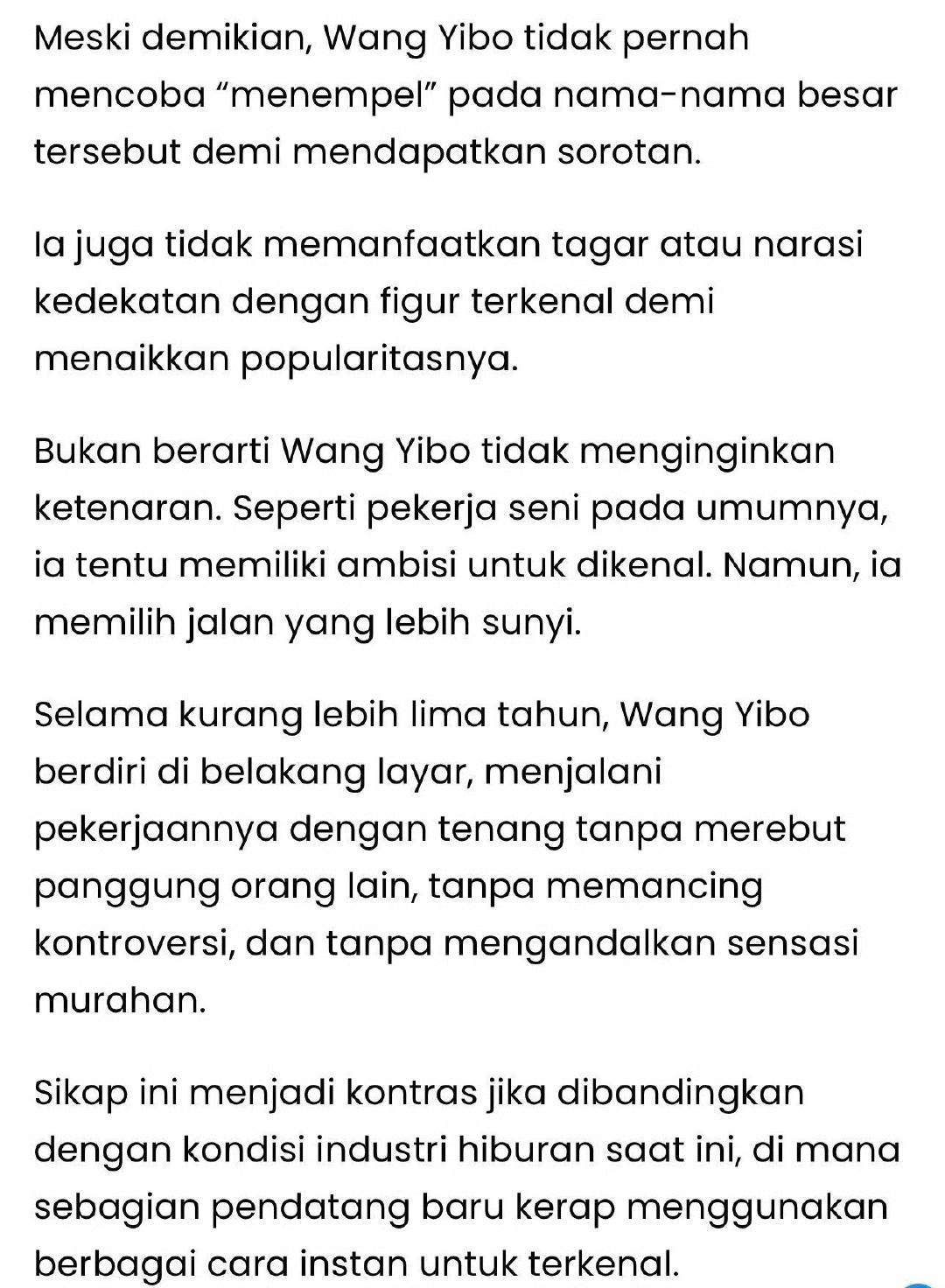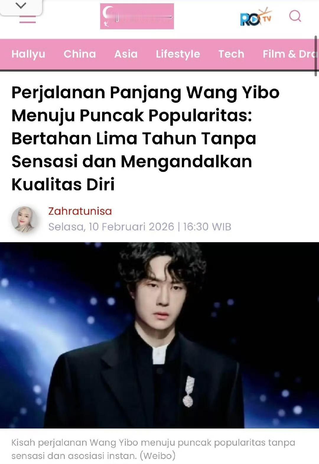 “王一博漫长的登顶之路:五年不靠炒作,凭实力站稳脚跟” 这不是粉丝自嗨的说辞,而是海外媒体、印尼媒体关于王一博的报道,走出粉粉黑黑的一亩三分地,大众的层面之上你会发现,太多人对王一博认知的广度和深度是让人惊叹的,也是相对客观公正的。 “王一博(Wang Yibo)的名字如今已成为中国娱乐圈成功的代名词。” “在被大众广泛熟知之前,王一博就一直刻意与“立人设”“炒热度”等捷径保持距离。” “王一博用行动证明,长久的人气,只能靠专业实力、自律和职业操守来建立。” “他选择让作品和能力自己说话,这份态度,让他不仅被尊为明星,更被视为一名真正的专业从业者。” 好文共赏,文章写得很精准透彻,恰如王一博很早的时候就已经有的清醒认知:“业务能力才是别人拿不走的资本”。