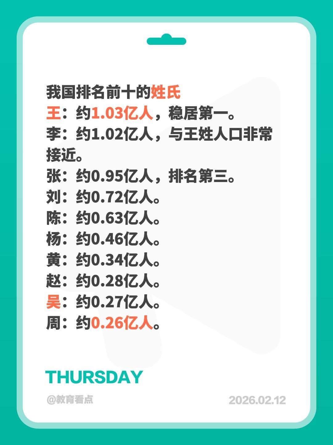 根据公安部户政管理研究中心2024年的最新数据,我国排名前十的姓氏依次是: 1. 王:约1.03亿人,稳居第一。 2. 李:约1.02亿人,与王姓人口非常接近。 3. 张:约0.95亿人,排名第三。 4. 刘:约0.72亿人。 5. 陈:约0.63亿人。 6. 杨:约0.46亿人。 7. 黄:约0.34亿人。 8. 赵:约0.28亿人。 9. 吴:约0.27亿人。 10. 周:约0.26亿人。 简短说明: * “王李张”三巨头:王、李、张三大姓人口均接近或超过1亿,占据了全国总人口的约22%。 * “百家姓”格局:前十大姓氏的总人口约占全国户籍总人口的40.5%,说明我国人口在姓氏上相对集中。
