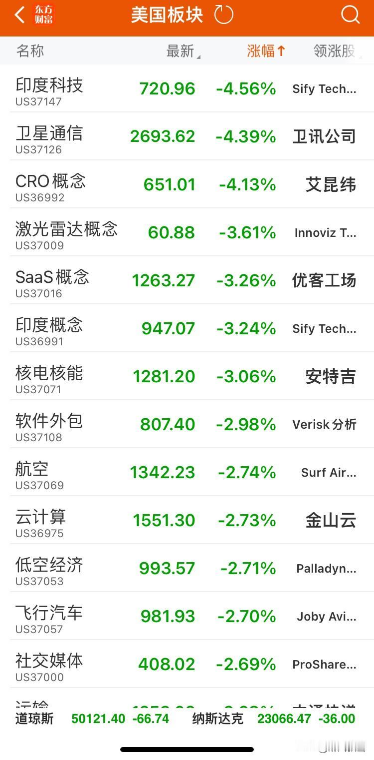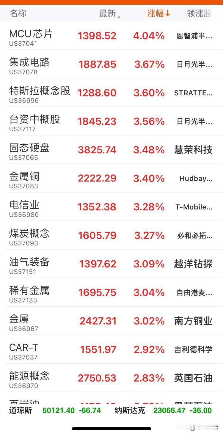 美指数 道琼斯微跌0.13%,纳斯达克跌0.16%,标普500收平。 MCU芯片、集成电路、特斯拉概念股领涨,涨幅超3.6%; 卫星通信、CRO概念领跌,跌幅超4.1%。 中概金龙指数跌0.65%,市场呈现科技硬件与大宗商品走强、成长科技板块承压的分化格局。