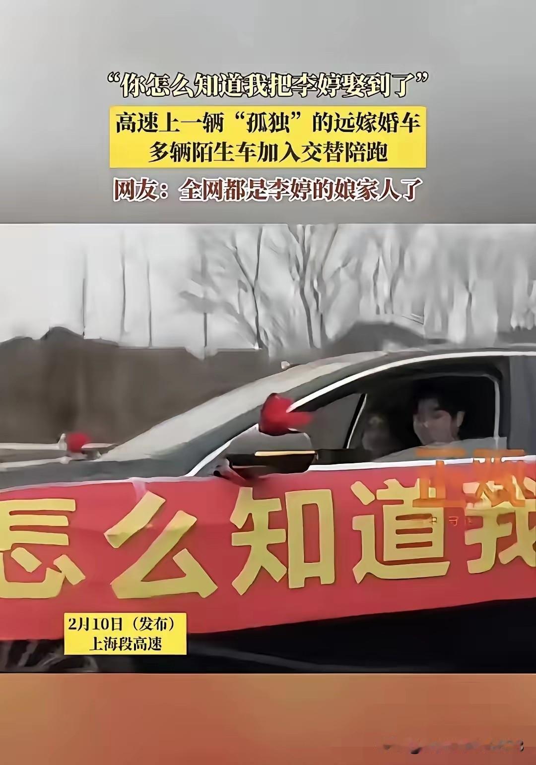 兄弟,我们不清楚你是如何把李婷娶回家的,但我们看到了你展现出的国人独有的浪漫! 在江苏无锡的高速公路上,一辆挂着横幅的婚车吸引了众多爱心车主接力。他们在各自行驶的路段打开双闪,跟在车后,用这种独特的方式祝福这对新人! 如今全网都在祝福李婷,祝福这对新人新婚快乐! 只要人人都献出一点爱,世界将变得更加美好!