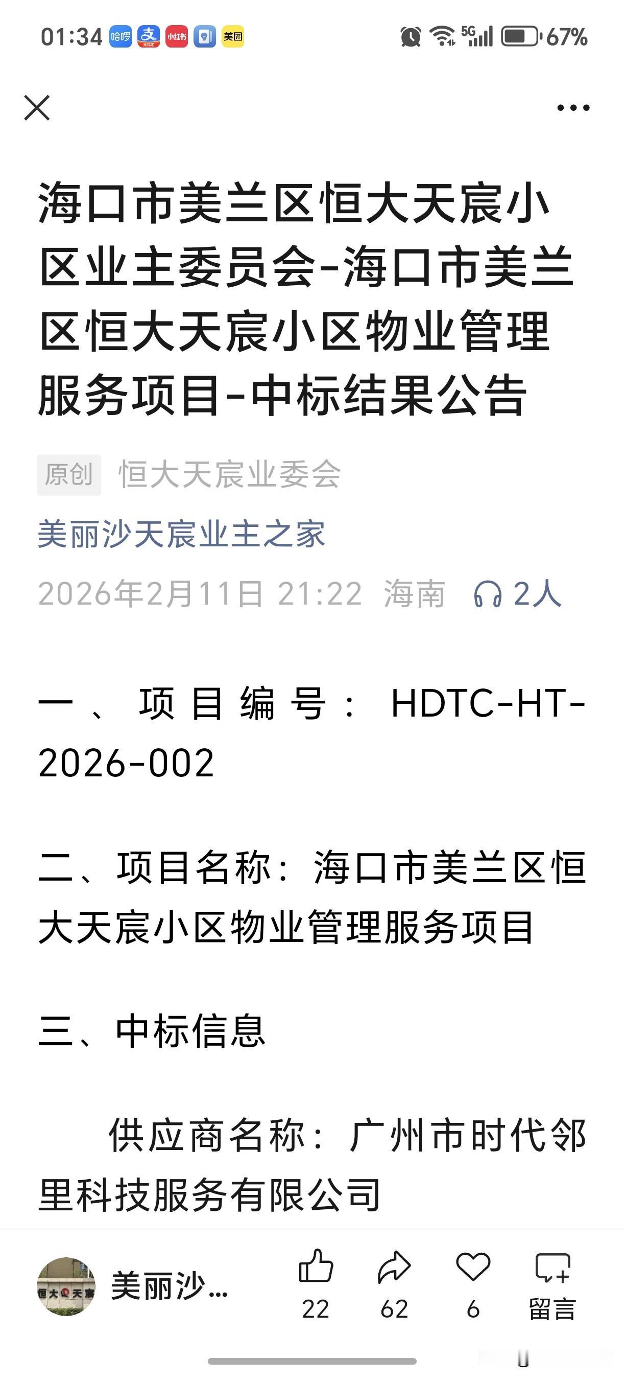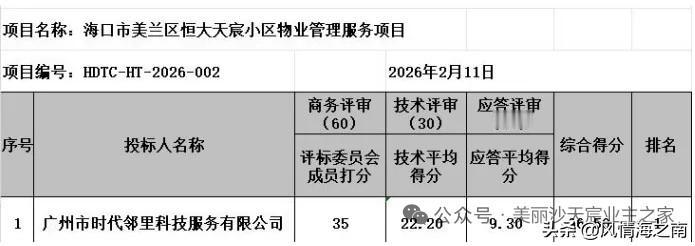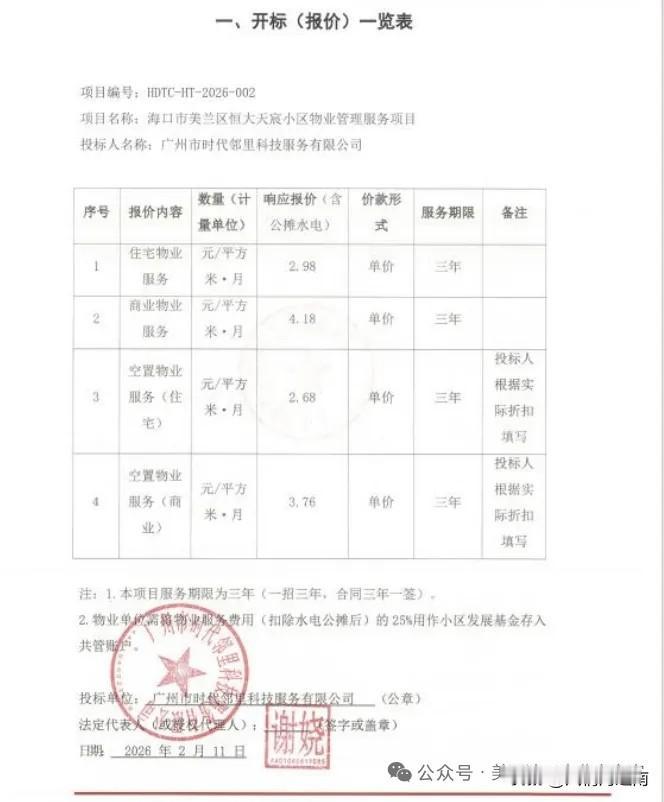 美丽沙恒大天宸小区新物业招投标刚刚揭晓,广州时代邻里来了,恒大天宸小区恒大两字从此该去掉了,成为历史。 广州时代邻里公司在招投标中以2.98元/㎡的价格胜出,比之前3.8元/㎡便宜了不少。而最硬核的是新公司满足了业主们的要求,将25%存入共管帐户作为小区的发展基金,这个基金应该就是专用于搞小区建设的,也就是2.98(应扣除公摊未计)再扣除25%,实际上就只有2.2多,换句大白话说,新物业收费从原先的3.8陡降到相当于2.2,便宜不只一点点。 这笔账算下来,仅就物业服务费这一点就掳获了天宸小区全体业主们的心,从3.8到2.98到实际的2.2,周边其它小区业主除了羡慕,心思是不是也活络动摇起来了。 新物业具有港股上市公司的背景,实力也不错,在行业中属于第一梯队,这是该公司在海南的第一个住宅物业服务项目。 按计划今天(12号)是新旧物业交接的日子。 恒大天宸小区恒大两字从此该去掉了,恒大在美丽沙开发了14个小区,开头都冠以恒大xx小区之名,前期物业服务都是绑定开发商指定的金X物业。 不堪忍受3.8元的高价物业费,恒大天宸率先打响抗争第一枪,成为第一个赶走开发商物业,自主选择物业的小区,此举象征性意义重大。其他13个恒大系小区都在盯着天宸的一举一动呢。 强大的竞争对手来了就在身边,金x物业应该也感受到了压力,看到了危机,同样的小区不一样的收费,多米诺骨牌何时倒下,金x物业何去何从,后续就看金x物业如何加强服务降低收费了。