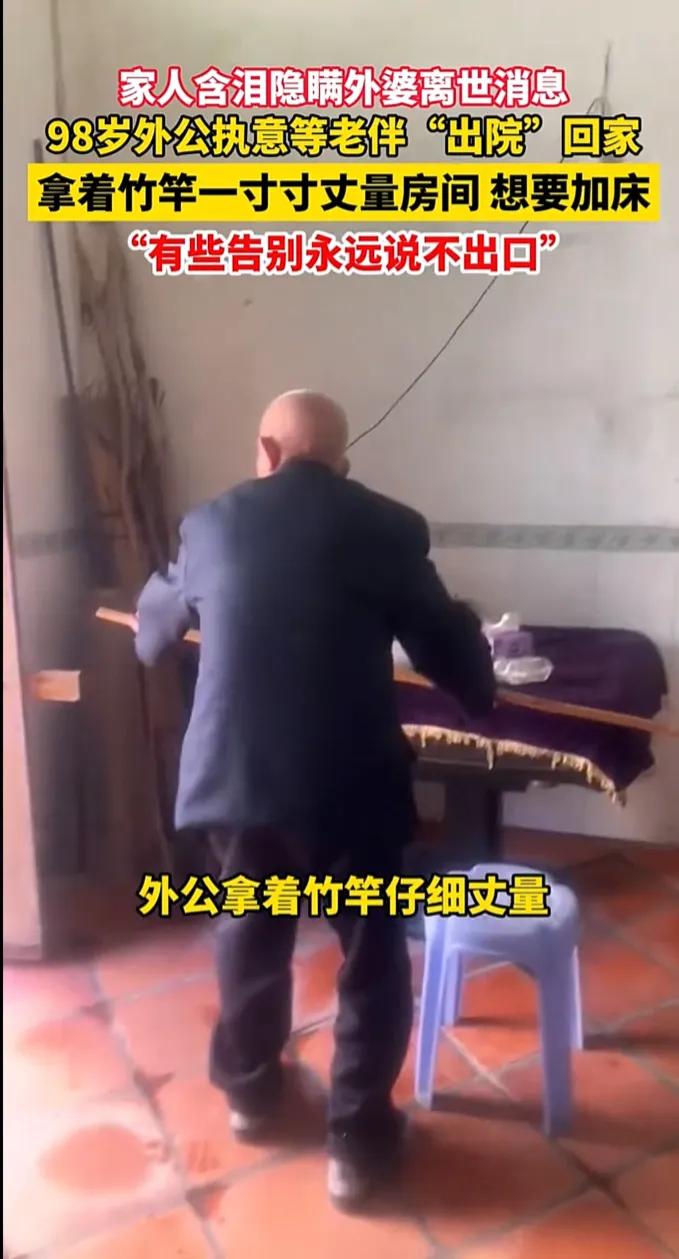 泪目了!家人含泪隐瞒外婆离世消息,98岁外公执意等老伴“出院”回家,拿着竹竿一寸寸丈量房间,想要加床“有些告别永远说不出口”。 福建的这户人家,最近都活在一个小心翼翼的“谎言”里。外婆走了,家里人商量了又商量,最终还是决定把这个消息瞒住98岁的外公。不是故意要骗他,是真的不敢说。外公的身体本就不好,耳朵也背,可唯独对老伴的事,记得比谁都清楚。 他们对外公说,外婆只是去医院“调理身体”,过阵子就回来。外公信了,每天搬个小凳子坐在门口,眼睛盯着巷口的路,盼着那个熟悉的身影出现。他还特意找出家里那根磨得发亮的竹竿,在房间里一寸一寸地量。他要给老伴加床,等她回来,就能像以前一样,睡在自己旁边。 家里人看着他佝偻着背,拿着竹竿比来比去,心里像被刀割一样疼。他们不敢上前打断,只能偷偷抹眼泪。这个谎言,像一层薄薄的窗户纸,明明一戳就破,却没人忍心去捅破。 有人说,这样的隐瞒太残忍,不如让老人直面现实。可只有真正经历过的人才懂,有些告别,真的永远说不出口。对98岁的外公来说,老伴不是“离世”,只是暂时“离开”。这个谎言,是他对抗孤独和绝望的最后一根稻草。 我们总说要“尊重现实”,却常常忽略了,对有些人而言,“现实”就是压垮他们的最后一根稻草。家人的隐瞒,不是欺骗,而是一种温柔的守护。他们宁愿自己承受着思念和愧疚,也要给老人留一个念想,留一份希望。 这让我想起了很多类似的故事:有人为了不让父母担心,隐瞒自己在外打拼的艰辛;有人为了不让孩子害怕,隐瞒自己身患重病的消息。这些“谎言”,背后都是沉甸甸的爱。 在这个快节奏的时代,我们习惯了用理性去衡量一切,却忘了,有些时候,爱比真相更重要。当生命走到尽头,当离别无法避免,我们能做的,或许就是用最温柔的方式,守护好最后一点温暖。 各位读者你们怎么看?欢迎在评论区讨论。
