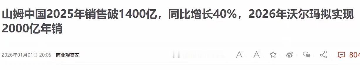 更扎心的是中国战场。2024年,山姆中国全渠道销售额破1005亿元;2025年,直接冲到1400亿元,同比大涨40%;2026年目标更激进:全年冲2000亿,单店再增15%。