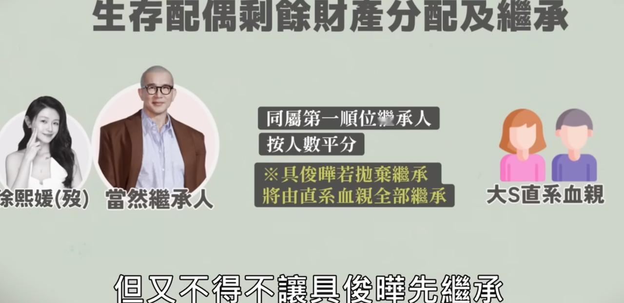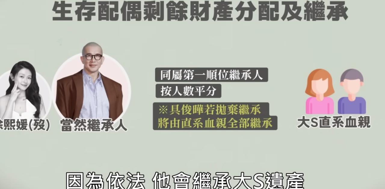 大s的遗产问题,根据台媒的最新说法,已经有进展了 最后的结果,应该是配偶子女,3个人均分 比如说遗产3000万,具俊烨1000万,两个孩子各1000万 然后,具俊烨继承的钱,应该会转给大s的母亲黄春梅 当然了,最终还是以纸上写的为准,其他推测不准 毕竟具俊晔这部分应该是已经搞定了,就看汪小菲这边和两个孩子是什么意思了,我觉得,最后也会同意这个方案的 现在有质疑的部分,就是大s留下的那些名牌珠宝,包包都去哪里了,毕竟这些东西的价值也不菲,肯定也是遗产的范围之内了 S妈找律师很正常啊, 因为遗产有一部分是子女继承,而子女未成年时这笔巨额遗产会不会被有心人掌控或乾坤大挪移,为孩子多想多防着点也是人之常情,不是吗. 除此之外,还是为了防什么争议或避税,都有可能,不是吗 我觉得,现在都炒成这样了,真要是拿一些不该拿的钱,真的要被喷死了