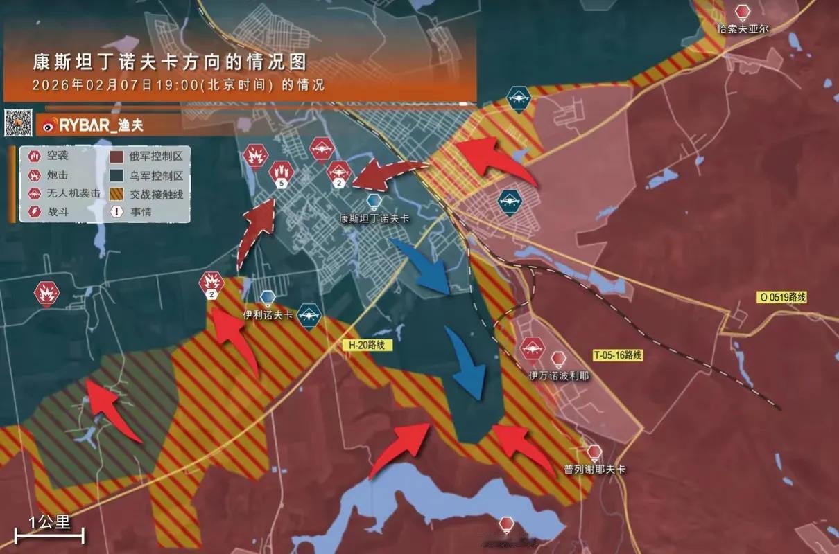 乌东防线多米诺效应开始了 康斯坦丁诺夫卡危局:乌东防线多米诺效应即将开启! 截至2026年2月初,顿涅茨克州的战局呈现一边倒态势。俄军已控制该州约四分之三的区域,乌军仅剩以康斯坦丁诺夫卡为核心的最后一道主要防御带在苦苦支撑。这座城市的得失,将直接决定整个乌东战局的走向。 康斯坦丁诺夫卡不仅是连接斯拉维扬斯克、克拉马托尔斯克等乌军核心据点的枢纽,更是后勤补给的关键节点。 一旦失守,其以北几乎所有乌军控制区都将暴露在俄军密集火力和无人机打击范围内,乌军补给线将面临被彻底切断的风险。 俄军采用多点突破的战术,已从多个方向对康斯坦丁诺夫卡形成围攻。 西南方向,俄军控制了斯捷潘诺夫卡镇,切断乌军西部增援通道;东北部,俄军夺取了210战略高地,获得观测与火力优势;东南方向,俄军已攻入城区并占领南城火车站。 更严峻的是,俄军还使用重型航空制导炸弹摧毁了附近的水库大坝,导致洪水涌入城区,切断了东西交通,约3000名乌军被困河南岸区域。 乌军面临多重困境: 兵力严重短缺,前线每公里区域内步兵不足10人;无人机操作员仅能覆盖30%前线需求;补给线路遭持续打击。为缓解兵源危机,乌克兰甚至不得不允许60岁以上人员服役,但难以快速扭转局势。 康斯坦丁诺夫卡若被完全控制,乌军在顿涅茨克的防御体系将彻底瓦解,俄军将获得向北推进的通道,进而威胁斯拉维扬斯克-克拉马托尔斯克城市群。 这座工业重镇的命运,已成为乌东战局的晴雨表,走向将影响整个俄乌冲突的进程。