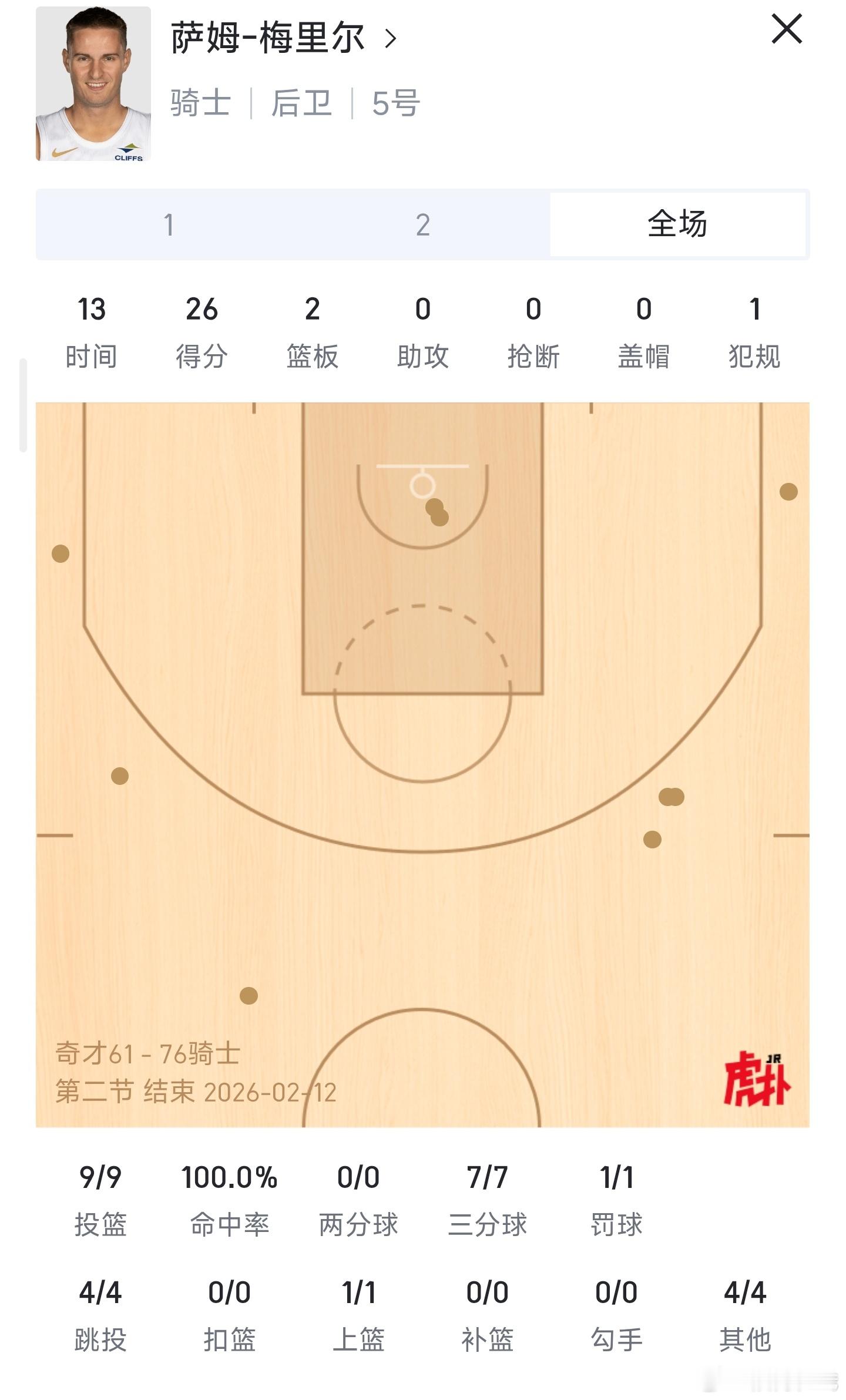 奇才vs骑士 梅里尔半场9投9中,三分7中7…这也太准了