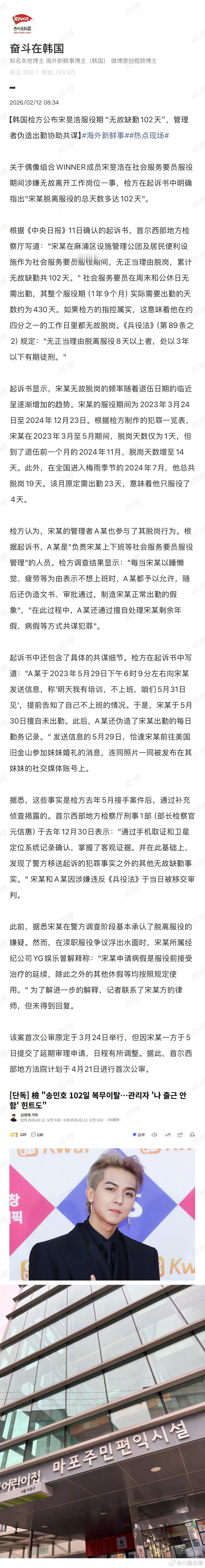 韩媒报道,宋旻浩服役缺勤102天或将被判刑检方起诉宋旻浩在社会服务工作中累计缺勤102天,构成无正当理由擅离职守。若该说法属实,根据韩国兵役法规定,无正当理由缺勤服役8天以上者将被处3年以下有期徒刑