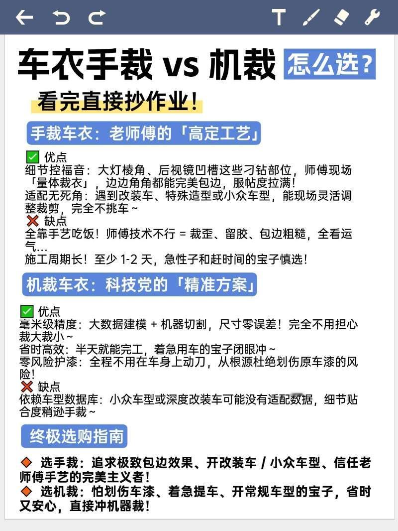 车衣手裁 VS 机裁怎么选?看完直接抄作业!家人们!给爱车贴车衣时,是不是被「手裁」和「机裁」整得头大?一边说手工更服帖,一边说机器更精准… 到底怎么选才不踩坑?今天从优缺点、适合人群全方位拆解,看完再也不纠结👇【来自懂车帝车友圈】