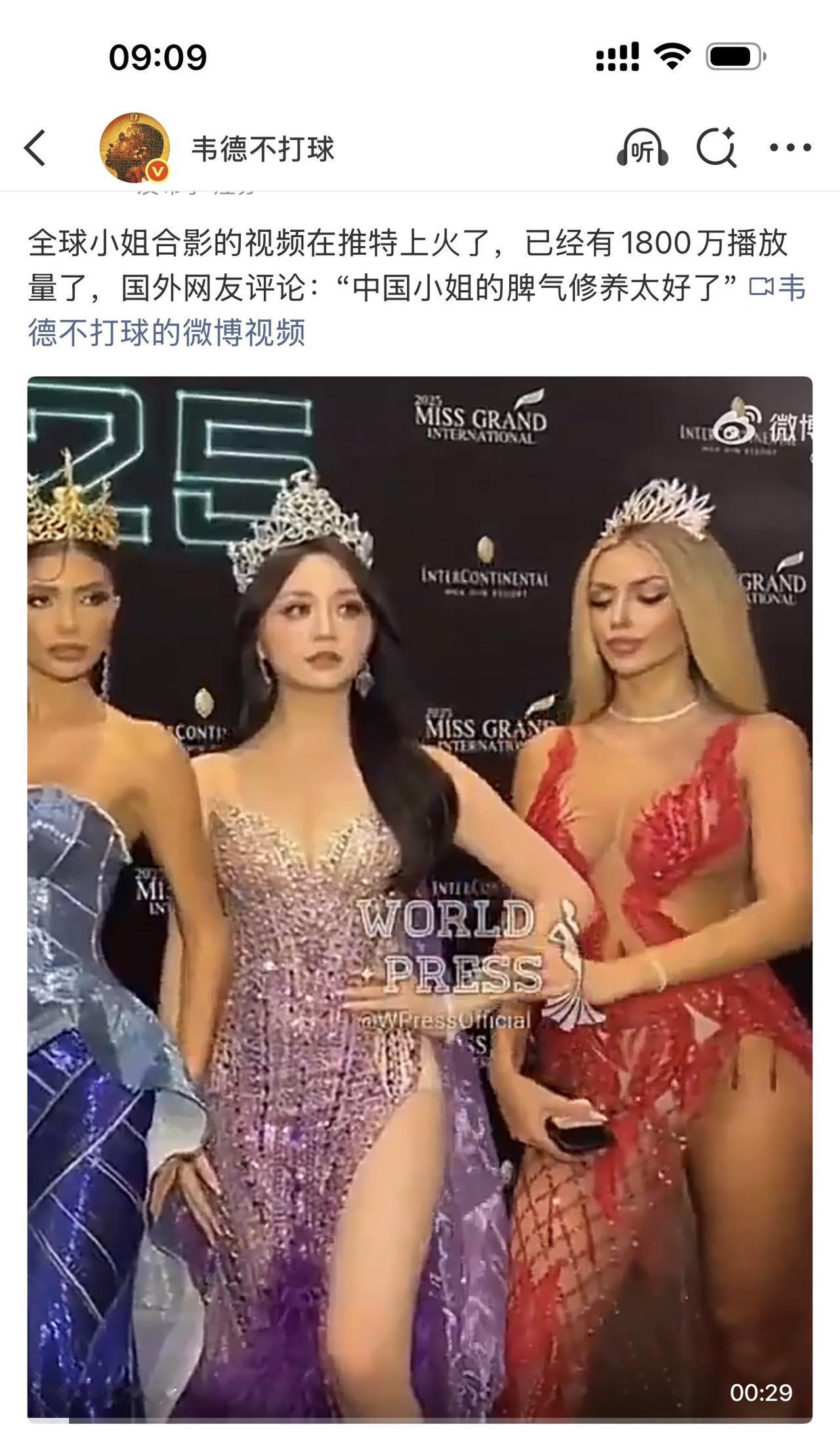全球小姐合影,这个穿红色透视装的外国女人,一直找事儿! 中国小姐摆pose,她一直捣乱,一直挑事儿,自己摆自己的呗,她一直给纠正干扰!莫名其妙!最后还搔首弄姿的一定要突出自己的腚!干什么啊!这是环球小姐,不是夜总会!你那套真的不适合这个场面! 选美比赛看来真的不能只看外表啊!此刻的她一点都不美!相反中国小姐表现出极高的涵养和耐心,要我早扇她了!无语凝噎! 国际场合大舞台,也多了去上不得台面的事情,目前这个视频外网火了,纷纷称赞中国小姐得体大方!那个女人偷鸡不成![捂脸][捂脸][捂脸][赞][赞][赞]