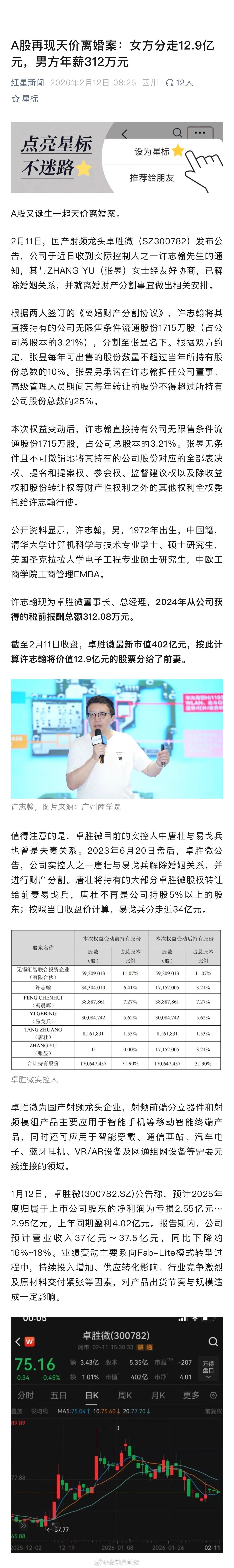 A股再现天价离婚案:女方分走12.9亿元,男方年薪312万元