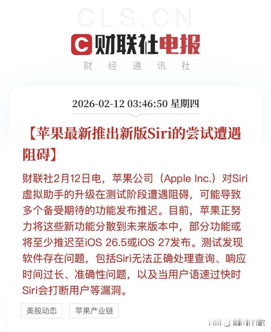 苹果这在AI方面彻底要掉队了吧... 没想到即将在下个月就要上线的AI驱动相关功能测试又翻车了~ 据说在近期内部测试中,新版Siri暴露出严重技术问题:包括响应延迟达1-2秒、无法正确处理跨应用请求(如"将相册照片发微信")、语速较快时强行打断用户说话,以及复杂任务失败率高达33%。 所以后续苹果或将核心功能分批次到各个系统版本内逐步上线,预计最早也要延期至年中后期。 再看看咱们国内各家的AI手机助手,小爱同学、小艺、YOYO等打通的功能是越来越多,甚至字节还直接推出了豆包AI手机,能够实现系统级的AI全面打通。 大伙觉得苹果后续能够追赶上来吗?