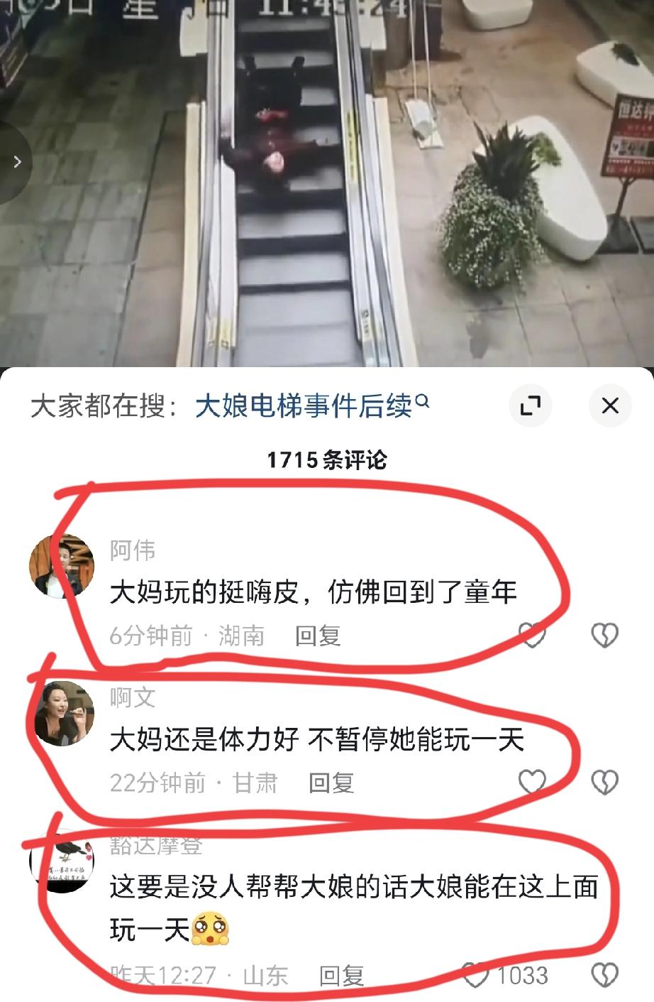 刚在抖音上看到一个视频,一位上了年纪的老人,在自动扶梯上摔倒了,她虽然一次次的试图自救爬起来,但因为身体的原因,一次次地都没有成功站起来,就这样在自动扶梯上几上几下地被翻滚着,直到电梯上一位老者从上边下来搀她,再加上旁边有人按下了紧急制动按钮。 看着这揪心的画面,但凡有点儿良知的,都会为这位老人担心。可评论区竟然会有如此没有人性的货色,发出如此泯灭良知的评论,这种货色,还算人吗!