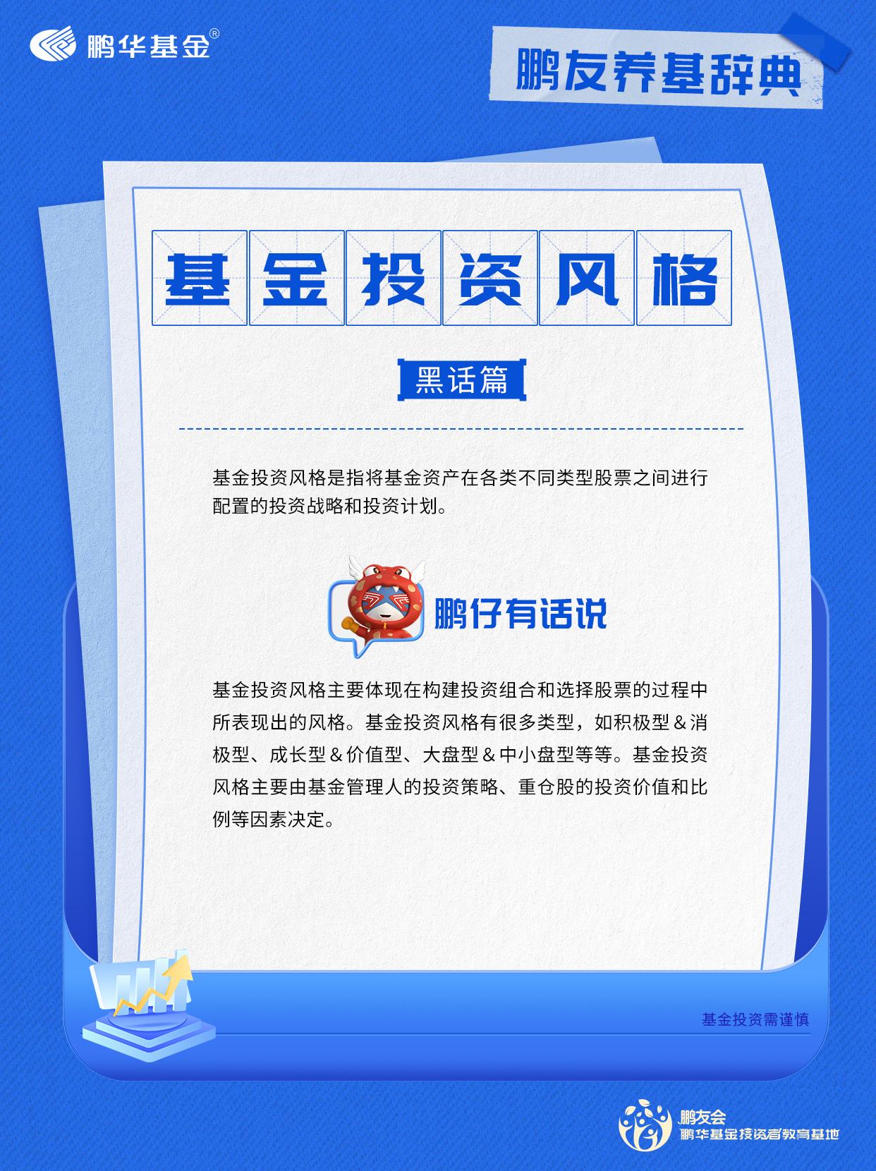 鹏华基金投资者教育基地许多人的投资风格都不尽相同,其实基金也是一样,基金由于所投资的标的不同、期限不同、风险不同被分为不同风格的基金。本期鹏友养基辞典就带大家了解下什么是基金的投资风格,一起去学习下吧~基金理财