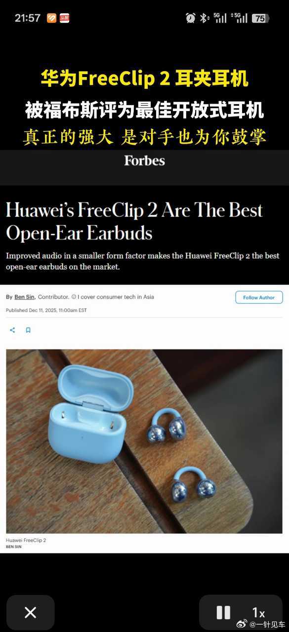 华为FreeClip 2耳夹耳机被福布斯评为最佳开放式耳机。这个我已经买了,是真的好用
