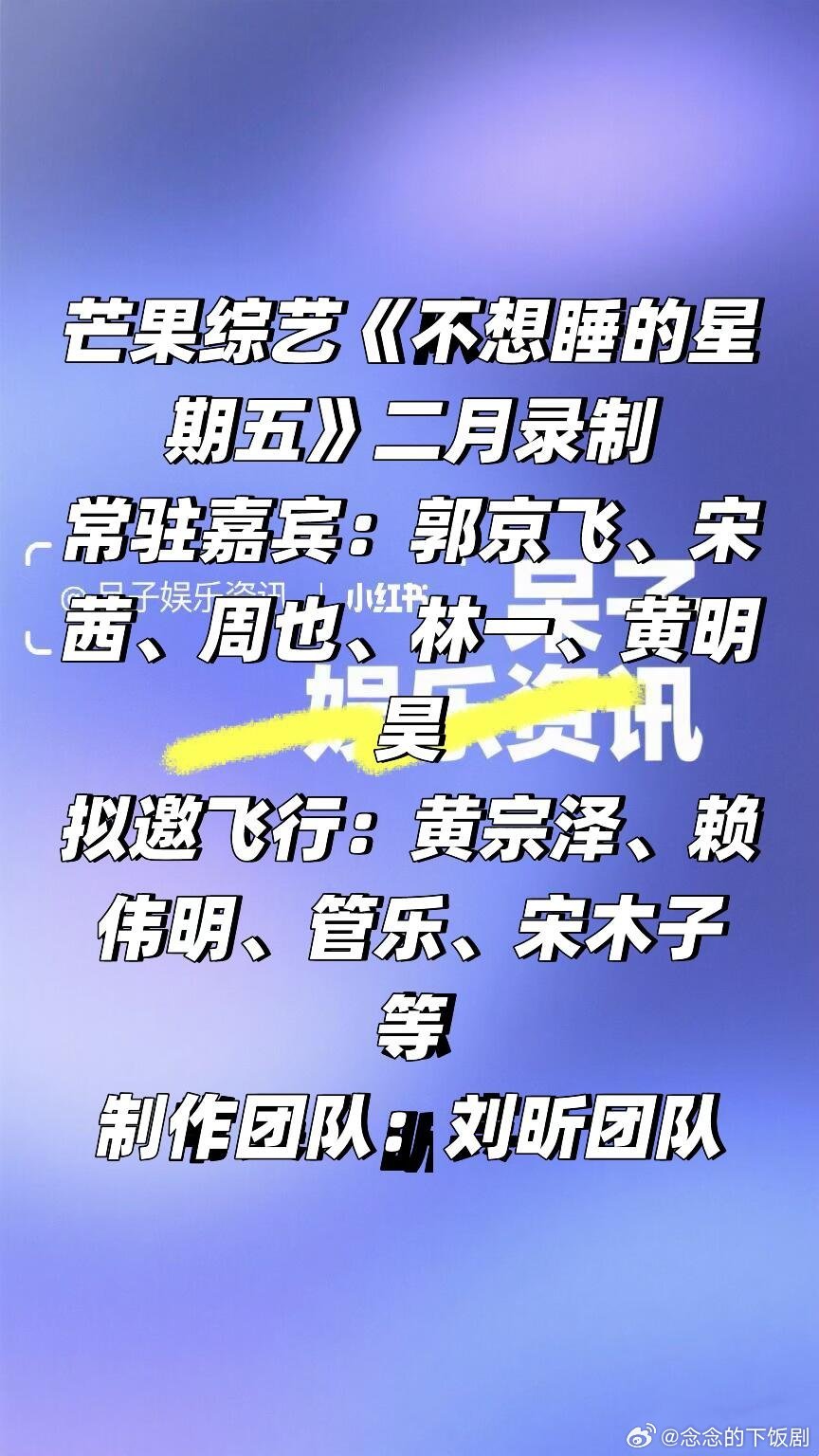 芒果综艺《不想睡的星期五》二月录制🍠常驻嘉宾:郭京飞、宋茜、周也、林一、黄明昊拟邀飞行:黄宗泽、赖伟明、管乐、宋木子 等制作团队:刘昕团队简介:为被996和内卷消耗的年轻一代,打造一档“精神充电宝” 式的综艺,直面当代人“卷不动躺不平”的集体焦虑!将夜晚从一天“终点”重塑为另一种 “起点”完成“逃离日常”到“创造夜欢” 的情绪升级。