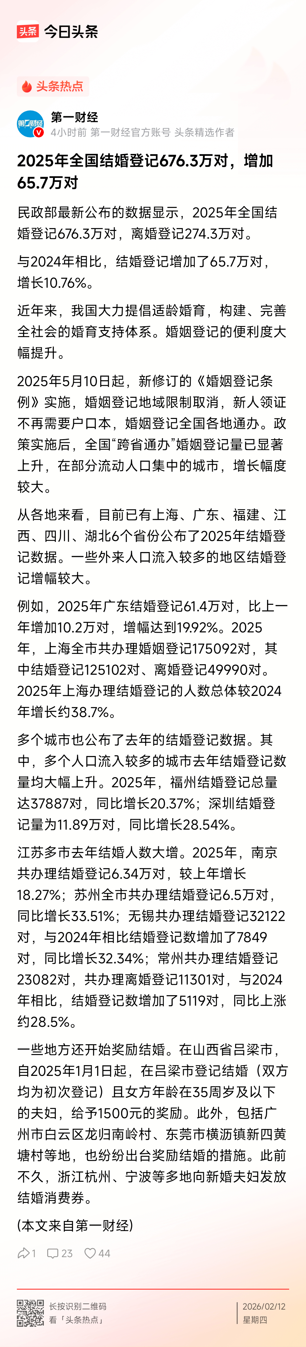 2025年全国结婚登记676.3万对,增加65.7万对。