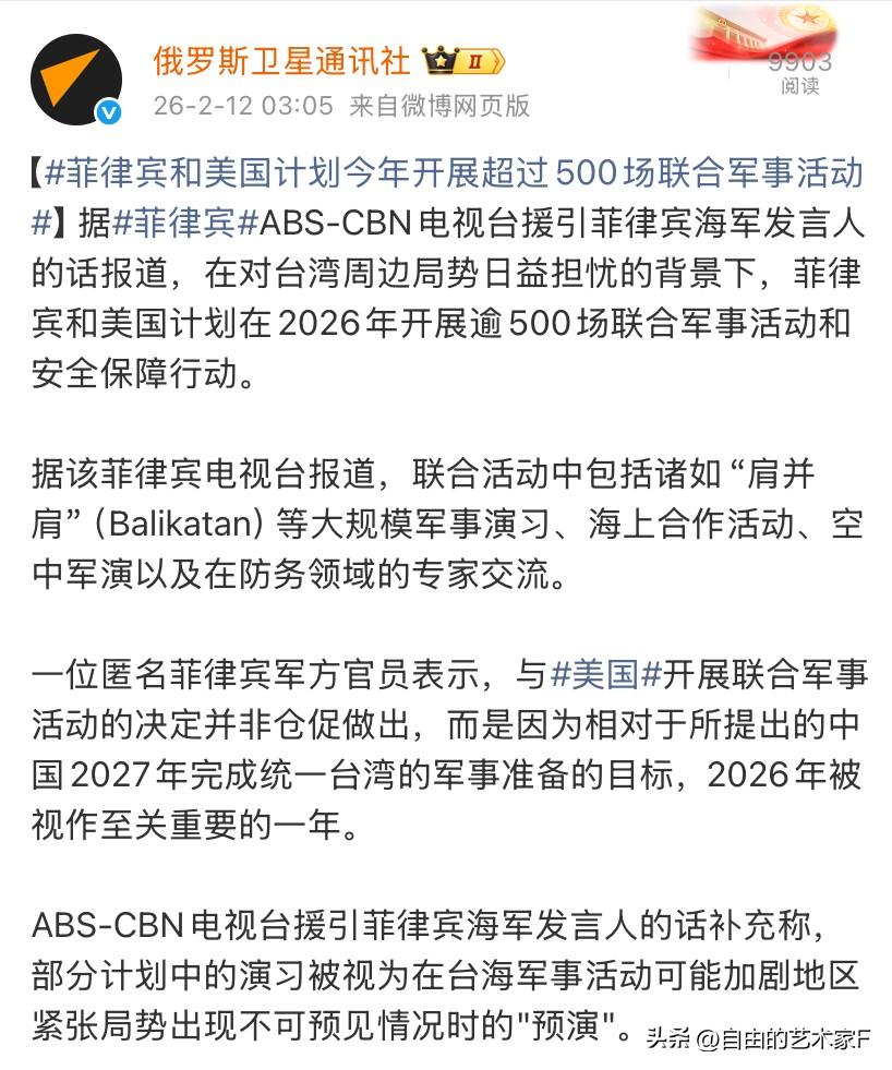 菲律宾一语惊人,和美国这么做,就是冲着中国来的 2月11日,菲律宾海军发言人指出,随着东亚局势的持续升温,和台湾周边局势日益紧张的背景下,菲律宾当局计划和美国在2026年共同在南海以及台海周边展开500场联合军事预演活动。 并且强调这样的大规模军事预演活动,不是临时起义。而是基于中方准备在2027年统一台湾所做的军事预演行动。 对于这件事情,我们是怎么看的?在美国的蛊惑下,菲律宾自以为抱上美国人的大腿,就可以肆意妄为踩踏中国红线,既然他愿意配合美国,在东亚地区成为反中先锋。那么我们就应该让小马科斯看到,菲律宾这个弹丸小国愿意重蹈乌克兰的覆辙要付出的代价。