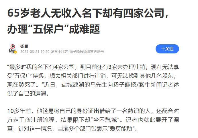 “太坑人了”。江苏盐城,65岁老人无儿无女,也没有经济来源,就去办理“五保户”,不料,工作人员却告知,他名下有3家公司未注销,不符合条件,这时老人才想到,自己当年吃了没文化的亏。 江苏盐城,一位65岁的老人,无儿无女、无依无靠,连基本的经济来源都没有,日子过得捉襟见肘,走投无路之下,他想起了可以申请五保户,靠着相关救助勉强维持往后的生活。 可谁能想到,一趟办理下来,不仅没办成,反而被泼了一盆冷水,工作人员的一句话,让老人瞬间懵了——他名下竟有3家公司还没注销,根本不符合五保户的认定条件。 老人一辈子没读过多少书,大字不识几个,一辈子勤勤恳恳,要么在田里劳作,要么打些零工,连自己的名字写起来都有些费劲,更别说注册公司、打理生意了。 他这辈子最大的心愿,就是能平平安安过日子,可随着年纪越来越大,身体也大不如前,干不动重活,没了收入来源,又无儿无女可以依靠,连温饱都成了问题。 后来,村里有人提醒他,像他这样无劳动能力、无生活来源,又没有法定赡养义务人的老人,可以去申请五保户,享受特困人员救助供养待遇,至少能解决基本的吃饭、穿衣和养老问题。 老人听后,心里燃起了一丝希望,特意收拾了简单的证件,一步步打听着,辗转来到当地负责办理五保户的相关部门,满心期待能顺利办成。 他小心翼翼地递上自己的身份证和相关证明,跟工作人员说明自己的情况,说着自己无儿无女、没有收入,实在没办法才来申请五保户。 工作人员接过证件后,按照流程进行查询核实,可查询结果出来后,却摇了摇头,告知老人他不符合申请条件,核心原因就是他的名下,登记着3家公司,而且都处于未注销的状态。 听到这句话,老人彻底慌了,一个劲地摆手,嘴里反复念叨着自己从来没开过公司,连公司是什么样都不知道,怎么可能名下有3家公司。 工作人员又反复核对了身份信息,确认没错,就是这位老人的名下,确实有3家未注销的公司,按照江苏省特困人员认定办法,这种情况确实无法通过五保户认定。 老人坐在办事大厅的椅子上,眉头紧锁,急得直掉眼泪,他想不明白,自己一辈子老实本分,没跟任何人结怨,也从来没接触过公司注册之类的事情,怎么就莫名成了3家公司的法人。 就这样,他坐在那里,冥思苦想了很久,那些被遗忘的往事,一点点在脑海里浮现,直到这时,老人才猛然想起,自己当年,是吃了没文化的大亏。 多年前,老人还能打些零工补贴家用,有一次,一个认识的人找到他,说自己有个小生意要办,需要借他的身份证用一下,还说只是走个过场,不用他出力,也不用他承担任何责任,事后还会给老人一点好处。 老人没读过书,不懂什么身份证不能随便外借,也不知道借身份证注册公司会有什么后果,再加上对方说得天花乱坠,又许诺有好处,就稀里糊涂地把自己的身份证借了出去。 当时,对方拿着他的身份证,让他在一些纸上签字,老人根本看不懂纸上写的是什么,对方只催着让他签字,说签完字就还他身份证,还能拿到好处。 老人没多想,就按照对方的要求,一笔一划地签下了自己的名字,签完字后,对方果然还了他身份证,也给了他一点小钱,这件事,也就这样被老人渐渐淡忘了。 他从来没有想过,当年那一次稀里糊涂的签字、一次大意的借证,会给现在的自己带来这么大的麻烦。 那些人借他的身份证,根本不是什么走个过场,而是用他的身份信息,注册了3家公司,而且这些公司经营一段时间后,就被弃之不管,一直没有办理注销手续,导致他莫名背上了“老板”的身份,也直接影响了他五保户的申请。 五保户申请被拒,老人依旧没有任何经济来源,日子过得十分艰难。他不知道自己该怎么办,也不知道要花多长时间、费多大劲,才能把名下那3家莫名出现的公司注销掉,才能顺利申请到五保户。 他只是一遍遍懊恼,懊恼自己当年的无知和大意,懊恼自己没文化,不懂法律,才会吃这么大的亏,落得如今这般境地。 对此,你们有什么看法,欢迎评论留言~