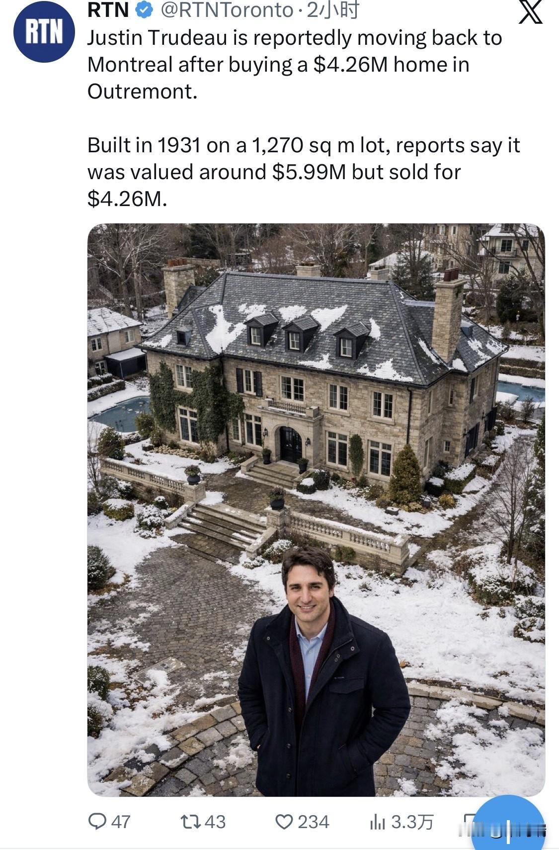 据报道,加拿大前总理贾斯汀·特鲁多在蒙特利尔郊区 Outremont 购买了一套价值 426 万美元的住宅后,将搬回蒙特利尔居住。 据报道,这是一栋建于 1931 年的两层单户住宅,位于皇家山(Mount Royal)北坡,占地 1270 平方米,估价约为 599 万美元,但最终以 426 万美元售出。 销售契约于 2026 年 2 月 9 日正式登记。文件显示特鲁多是唯一购买人,此时他已在 2025 年辞去总理职务,并正处于与索菲·格雷瓜尔的离婚程序中。 报道称特鲁多目前与美国歌手凯蒂·佩里(Katy Perry)交往,两人近期曾被目击在 Outremont 区的一家法式餐厅用餐。