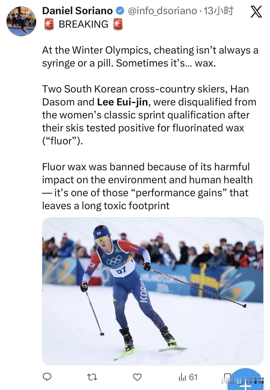 2026 年 2 月 10 日,在越野滑雪女子短距离传统技术资格赛结束后,国际滑雪和单板滑雪联合会(FIS)在例行设备检测中发现,韩国选手 Han Da-som(韩多顺)和 Lee Eui-jin(李义珍)的滑雪板底部涂层中含有违禁物质“氟蜡(Fluorinated Wax)”,两人随即被正式取消该项比赛成绩及参赛资格。 关于此事件及“氟蜡”禁令的关键点如下: 违规详情:两名运动员在当天的资格赛中分别排名第 70 位和第 74 位,原本已无缘晋级。但在赛后检测中,她们的设备因氟元素检测呈阳性,导致其名字从官方排名中被抹除。 为何禁用氟蜡: 极致速度(技术兴奋剂):氟蜡具有极强的疏水性,在潮湿或污浊的雪面上能显著减少摩擦,极大地提升滑行速度,因此被视为“技术兴奋剂”。 环境与健康威胁:氟蜡含有 PFAS(全氟和多氟烷基物质),被称为“永久性化学品”,无法被自然降解。它不仅会长期污染雪场土壤和水源,其在高温熨烫涂抹时产生的烟雾还会对打蜡师的呼吸系统造成严重伤害。 禁令执行:FIS 早在 2019 年就宣布了氟蜡禁令,并在 2023-2024 赛季正式全面强制执行,所有国际赛事均配备专门的氟元素快速检测仪进行赛后抽检。 此前,日本单板滑雪运动员柴真圣(Masaki Shiba)也在本届冬奥会的平行大回转比赛中因相同原因被取消资格,显示出国际赛场对该禁令的严厉执行力度。