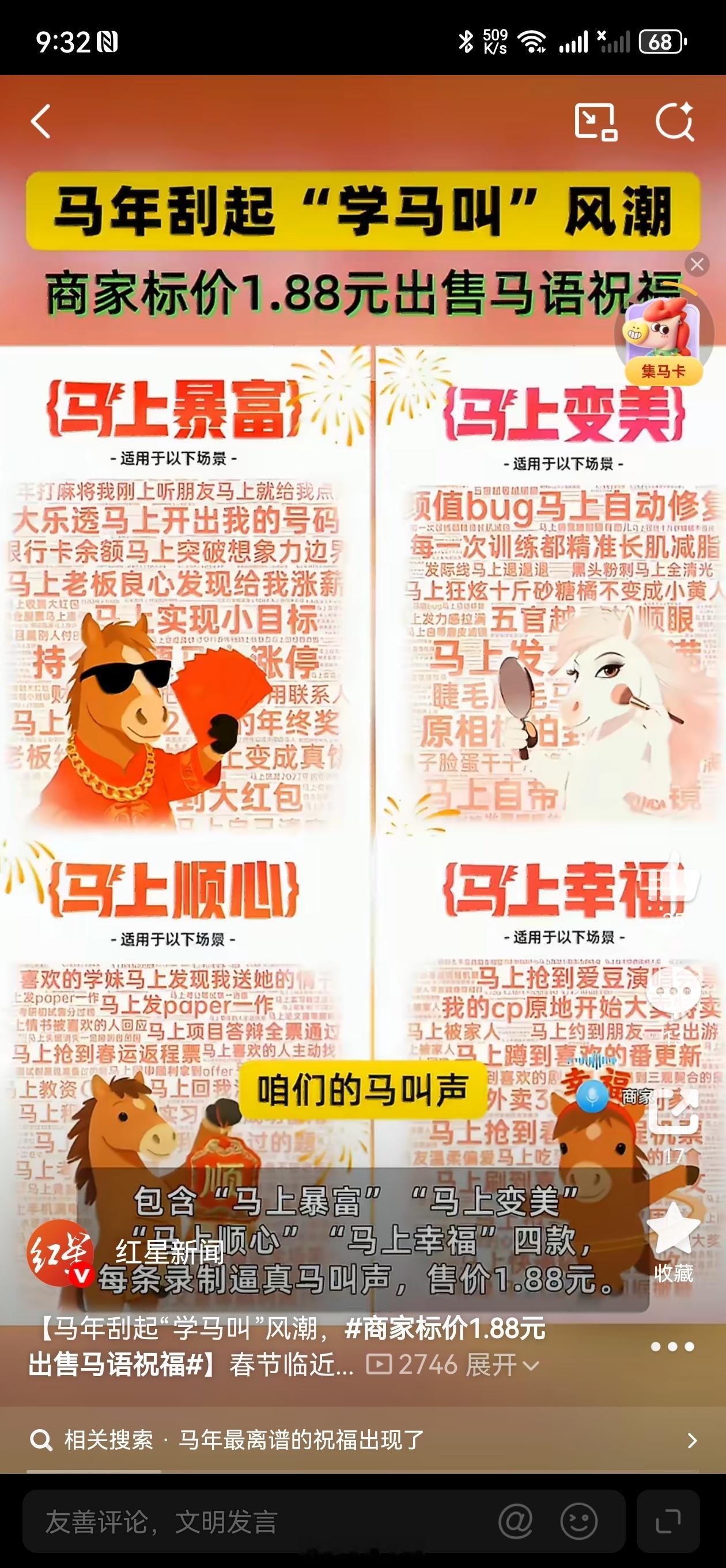 一则“学马叫”的音频能卖钱,且销量不俗,这背后是文化符号与情感经济的巧妙结合。“马”因其吉祥寓意成为情感载体,而逼真叫声则提供了出乎意料的幽默体验。这本质上是为“祝福”这一古老行为,披上了互联网时代“梗文化”的外衣。它价格低廉、形式新颖,完美契合了年轻人追求轻量化社交、厌恶过度客套的心理。用户购买的并非实用功能,而是一个能引发共情、制造话题的“社交开关”。从“祈福风铃”到“电子木鱼”,再到今天的“马叫祝福”,看似无厘头的消费背后,是当代人用轻松对抗焦虑、用创意表达真诚的生动写照。这或许为传统文化IP的现代化表达,提供了一个有趣的注脚。马年最离谱的祝福出现了商家标价1.88元出售马语祝福