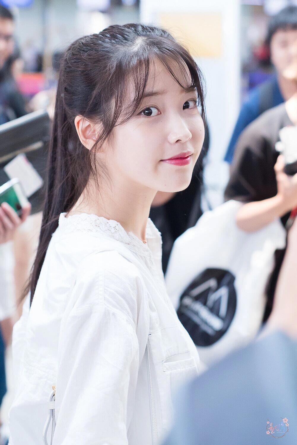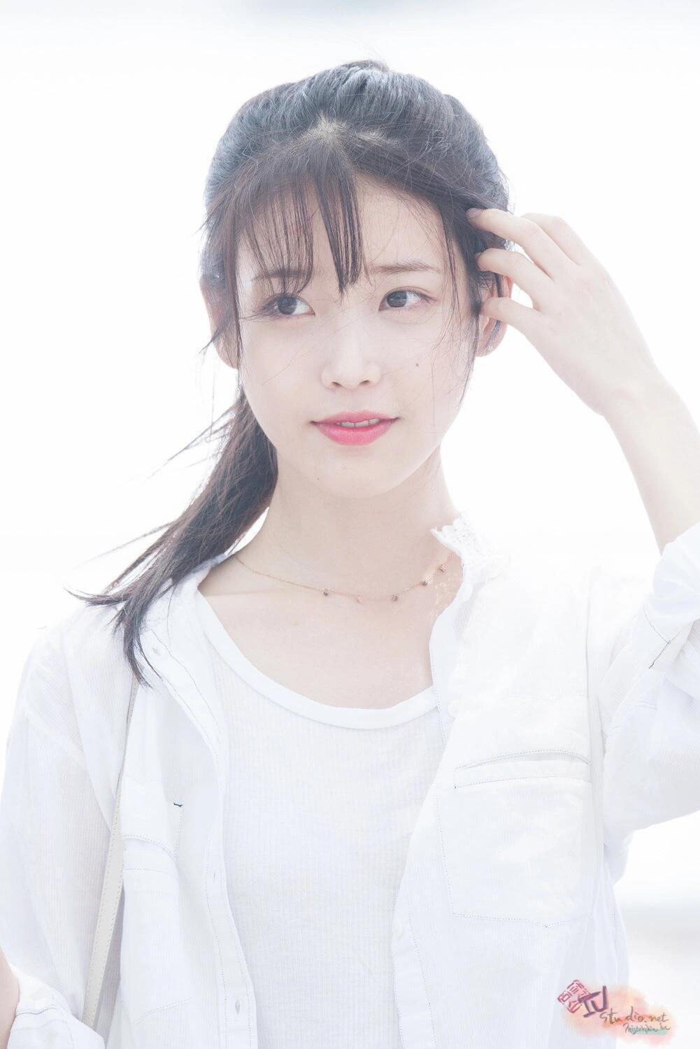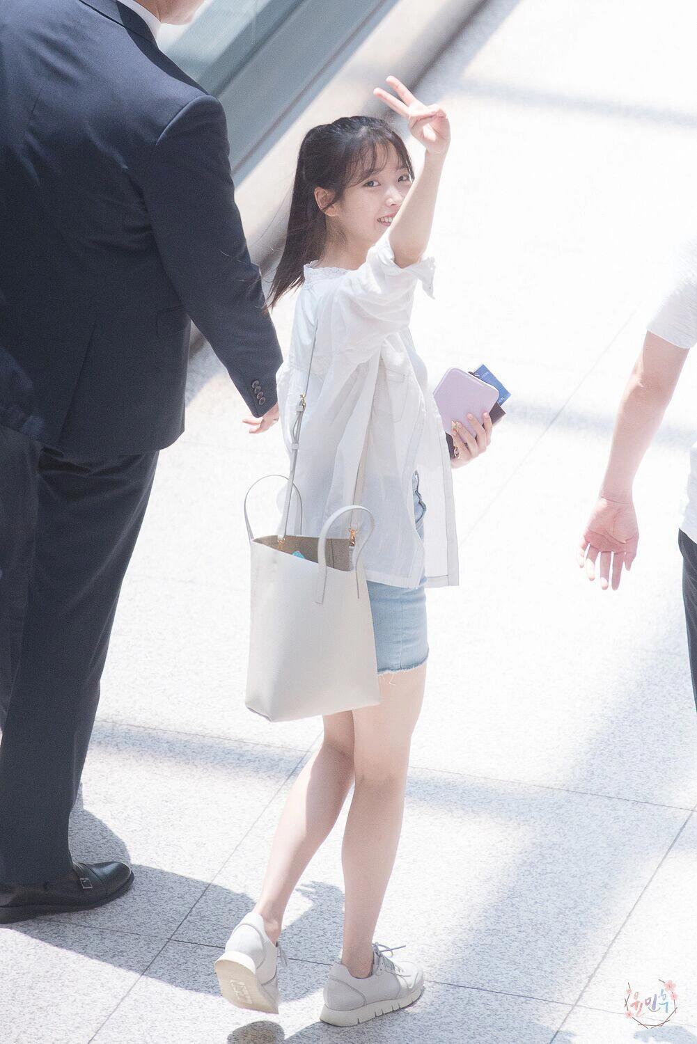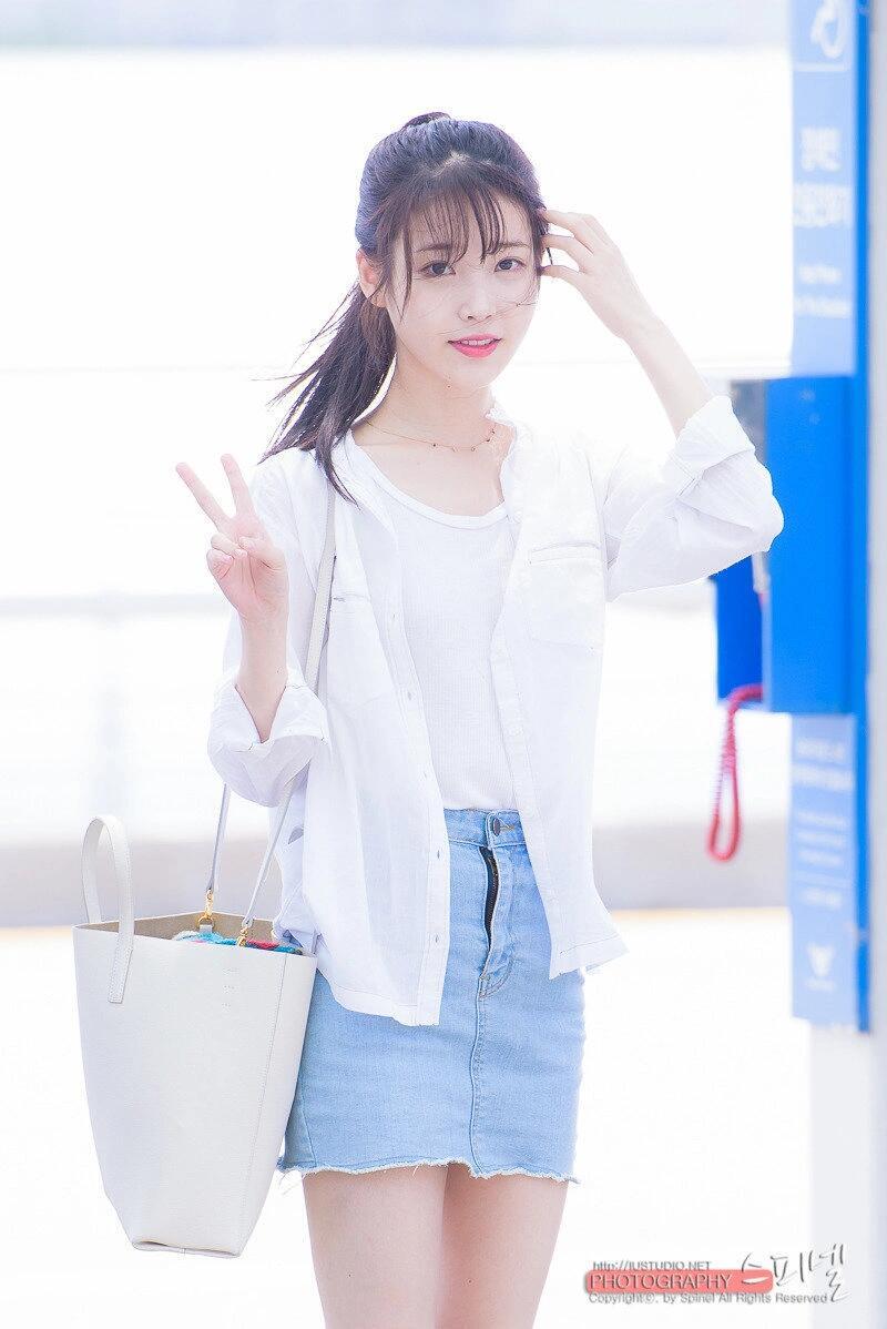 IU白色背心+浅色牛仔短裙+白色衬衫外套+白色水桶包+灰色运动鞋