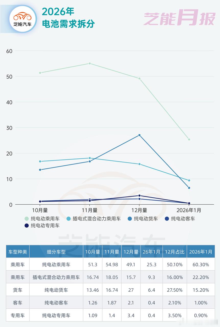1 月电池行业数据出炉,产量和总销量同比均大幅增长,储能电池更是爆发式上涨,成为行业新主线。国内电池装车量小幅增长、环比回落,磷酸铁锂依旧占据绝对主流。出口端整体平稳,动力电池出口保持增长,储能电池基本持平。