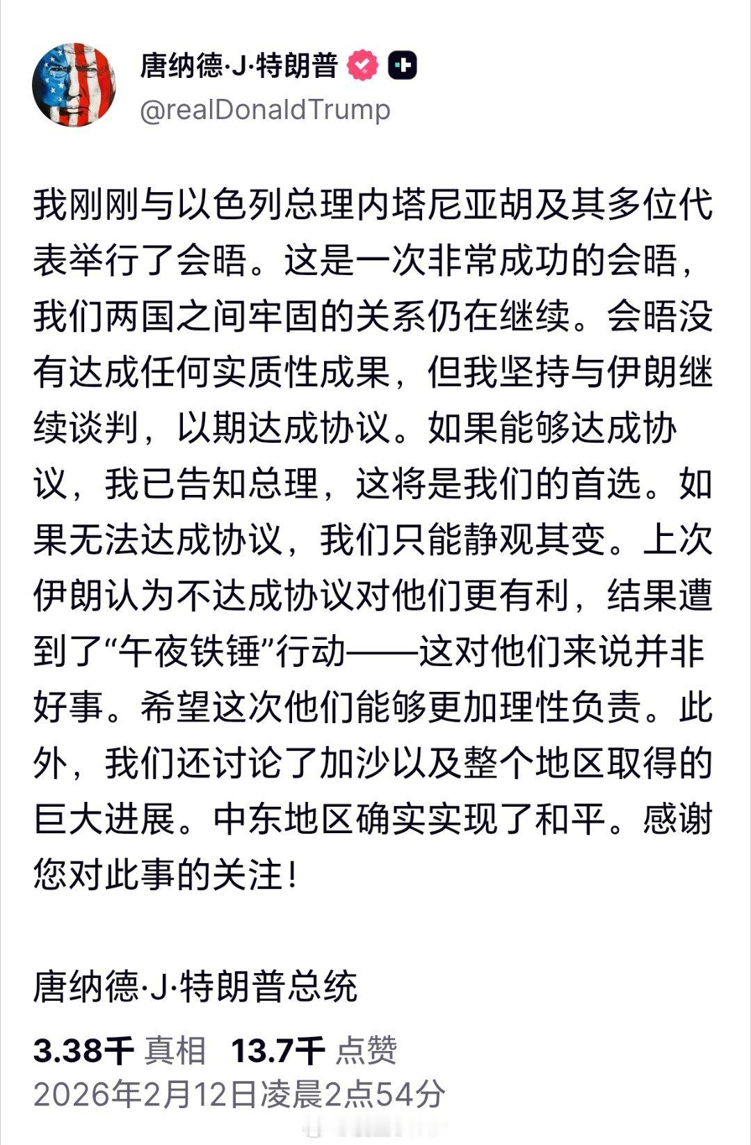 特朗普称美国将继续与伊朗谈判特朗普谈与内塔尼亚胡会面情况:坚持与伊朗继续谈判,以