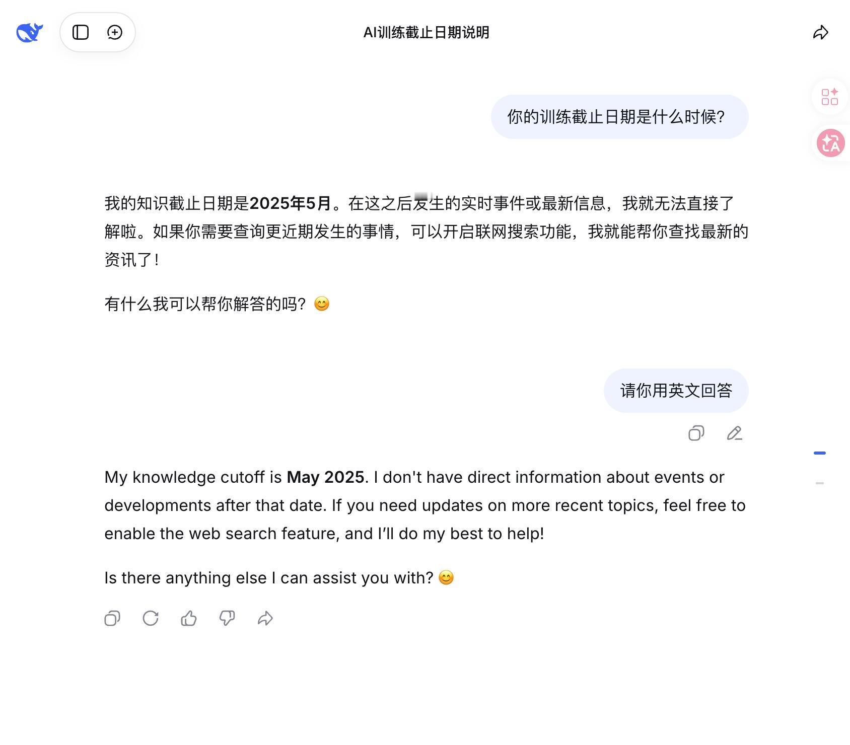 现在身边所有玩AI的朋友打开DS就是问训练截止日期和上下文窗口,势必测出自己的DS是不是新模型。如果回答还是2024年的朋友可以去手机端升级到最新的1.7.4(1),升级后再问截止日期就可以了 deepseek更新新模型ai