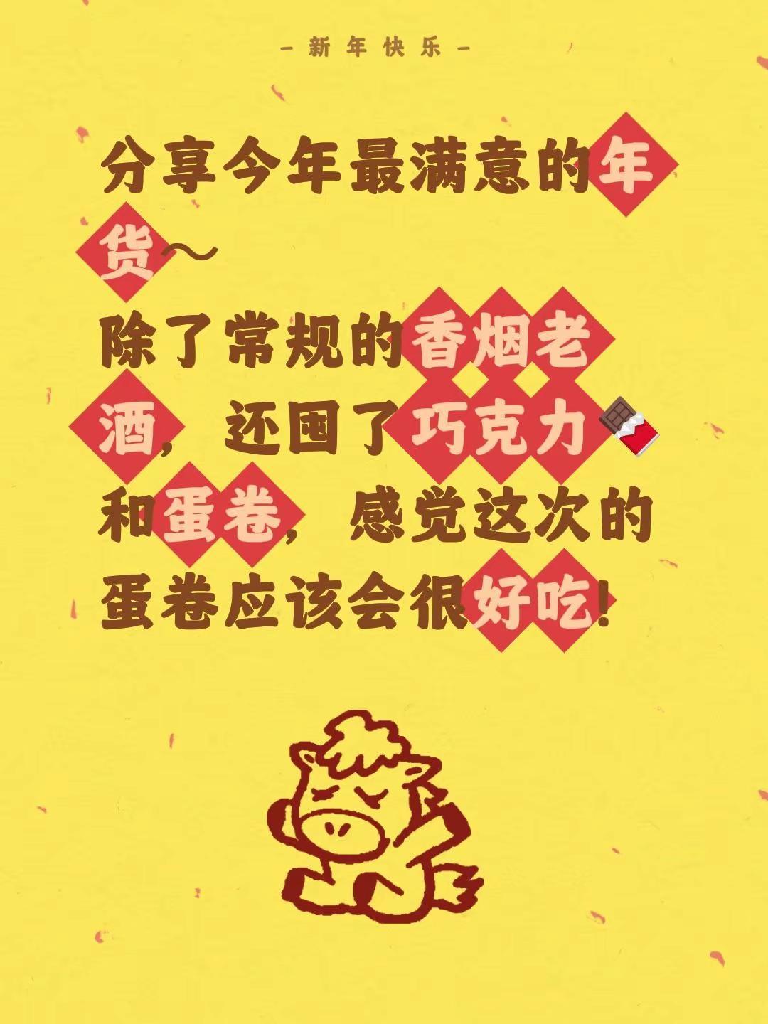分享今年最满意的年货~除了常规的香烟老酒,还囤了巧克力🍫和蛋卷,感觉这次的蛋卷应该会很好吃!年货清单