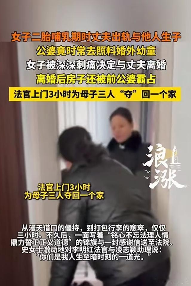 北京门头沟,女子二胎哺乳期间,发现丈夫竟然早就出轨了,还有个私生子,更可气的是,这事全家人都知道,公婆还经常过去照顾小三和她的孩子。女子离了婚,房子归她所有,可是公婆赖在她家不走,还把她关在外面不让她进去…… 据浪涨新闻报道,史女士和丈夫第一胎生了个女儿,女儿出生后,公婆借口帮他们带孩子,住进了他们的小家。 两代人住在一起,摩擦自然是少不了的,特别是公婆还秉持着老一辈的思想,嘴上念叨着是帮儿媳妇带孩子,实际上家务活都是史女士的,她还要额外照顾两个老人。 史女士非常疲惫,可恨的是,时间一长,丈夫也疲于应付这种家庭矛盾,他越来越不爱回家,和史女士的感情也越来越不好。 史女士不知道如何是好,婆婆经常在她旁边念叨,说她儿子不愿意回来,都是史女士不懂得怎么拴住男人的心。 还说史女士生了个丫头片子,如果给他们家添个孙子,就是他们家的大功臣,她一定把史女士当皇后娘娘一样供起来,还说史女士要是生了儿子,她就是绑也要把她儿子绑回来。 这种话听多了,史女士渐渐生出了生二胎的想法。 后来,史女士如愿怀孕,婆婆喜笑颜开,对她态度果然好了很多,史女士一心想生个儿子,可二胎生下来,还是一个女儿。 虽然史女士很想要个儿子,但是女儿她也同样喜欢,可公婆对她的态度立即冷淡了起来,丈夫也恢复了以前的态度,对她爱搭不理的。 史女士一边要带两个孩子,一边陷入自我怀疑,难道真的是她的问题吗?当然不是,史女士很快找到了答案。 史女士无意中发现,丈夫对她越来越冷淡,不是因为她不够好,而是他早就和他人有了苟且,并且两人还生了孩子。 此时史女士还在哺乳期,也就是说,她怀二胎的时候,那个女人也怀孕了,甚至在很久以前,丈夫就背叛了家庭。 史女士找公婆主持公道,可公婆竟然早就知道了他们儿子做的好事,并且,他们不觉得自己儿子做不得对,还很得意自己儿子有本事。 史女士回想起来,此前她一个人带两个孩子忙不过来,想让公婆帮她带一下孩子,公婆却借口有事经常出门。 现在史女士才知道,公婆并不是真的有事,而是去照顾小三和她的孩子了! 史女士三观尽毁,她受不了这种委屈,也不想让自己的孩子生活在爷爷奶奶不疼、爸爸不爱的家庭中,更不想让他们在这种没有底线的家庭里,养的和他们一样自私、冷漠。 于是,史女士毅然决然提出了离婚。 丈夫或许是心中有愧,或许是还保持着一丝良知,离婚诉讼中,最终判决房子归史女士所有,孩子也归史女士抚养,前夫放弃和史女士争房子和孩子的抚养权。 可让史女士没想到的是,事情竟然在前公婆这里卡住了。 二人拒不搬离史女士家,还天天在史女士家找事,史女士既要照顾两个年幼的孩子,又要独自修复受到的心理创伤,还要应对两个不讲理的老人。 史女士天天以泪洗面,整个人被折磨得摇摇欲坠。 更让她崩溃的是,趁她出门,前公婆竟然换了锁,将她关在外面不让她进门。 史女士一手抱着嗷嗷待哺的二女儿,一手拉着年幼的大女儿,站在楼道里崩溃了。 根据《民法典》中关于离婚财产分割的规定,夫妻离婚时,对于共同财产的处理,由双方协议处理。 史女士和前夫离婚时,双方达成了房子归史女士的协议,此时,房子的所有权已经归史女士所有。前公婆拒不搬离并换锁的行为,侵犯了史女士的房屋所有权。 史女士走投无路,找到了起诉离婚的门头沟法院,对方立即派人过来处理。 工作人员过来后,劝说两位老人搬走,可二人说时间太紧,搬了东西没地方放,过了一会又说买回老家的票要等几天。 二人翻来覆去,只是为了拖延时间。 经过三个小时的漫天讨价,工作人员说,如果他们今天搬走,她自掏腰包,给他们补两天的住宿费。 又向他们普法,如果他们拒不搬走,根据《刑法》第三百一十三条规定,还可能构成拒不执行判决、裁定罪。 二老见实在赖不下去了,最后只好灰溜溜的打包行李,当天就搬离了史女士的房子。 史女士非常感动,制作了一面锦旗,又写了一封感谢信,感谢帮助自己的工作人员。