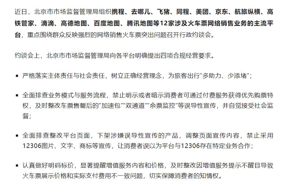 携程、去哪儿、飞猪、同程等12家第三方火车票网络销售平台被约谈! 这种情况持续很多年了,不明白为什么现在才约谈整改。这些第三方平台实际上成为了最大的黄牛,加价就能帮忙抢到票,这和线下的黄牛有什么区别呢? 而且,他们不只是当黄牛,还捆绑销售保险产品。比如在携程购票,在付款环节会自动捆绑一个保险产品,字幕非常小,如果不去掉勾选,会自动加上,价格比实际票价高。很多人因为着急抢票,就可能直接付款了,买了一个不需要的保险,平台就轻松把钱给赚了,这明显是欺骗消费者。 有人可能会说能抢到票,我愿意加价。但这对于那些不懂,不愿意加价的人来说不公平。从国家的角度来说,买火车票就应该平等。如果不制止加价行为,那带来的结果就是正常买票渠道失灵,平台会不断抬高加价,让老百姓的购票成本不断提高。 当然,这些第三方平台也不是一无是处,比如它可以显示往后几个站还有余票,这个就挺好。不过,第三方平台还是要透明,少搞一些虚假宣传,捆绑销售。