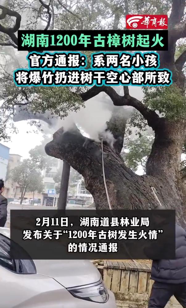 两熊孩子扔爆竹致千年古树着火! 真火大!两个小孩往树干空心的地方扔爆竹,把一棵1200年的古树给引燃了,这不就是现实版“魔丸男孩”吗? 熊孩子闯祸,背后百分百是熊家长的锅!说到底还是家长监管不到位,平时不管教、不提醒,任由孩子拿着爆竹乱玩,才酿成这种大祸。 1200年的古树啊,多少代人守护下来的,就被两个不懂事的小孩毁了,真的太心疼!强烈建议重罚这两家家长,光口头教育没用的,最好罚到他们家里暂时买不起鞭炮,让他们长长记性!