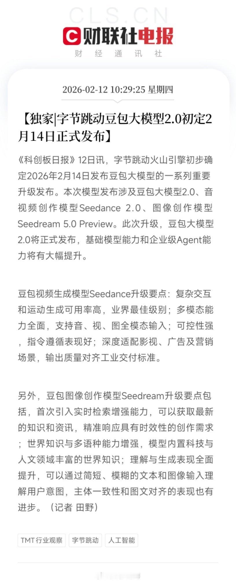字节跳动AI大模型迎来重要更新,豆包大模型2.0定档2月14日发布。同步推出Seedance 2.0音视频模型与Seedream 5.0 Preview图像模型,全面升级基础能力与智能体应用,打造更强多模态创作与企业服务能力。(财联社)