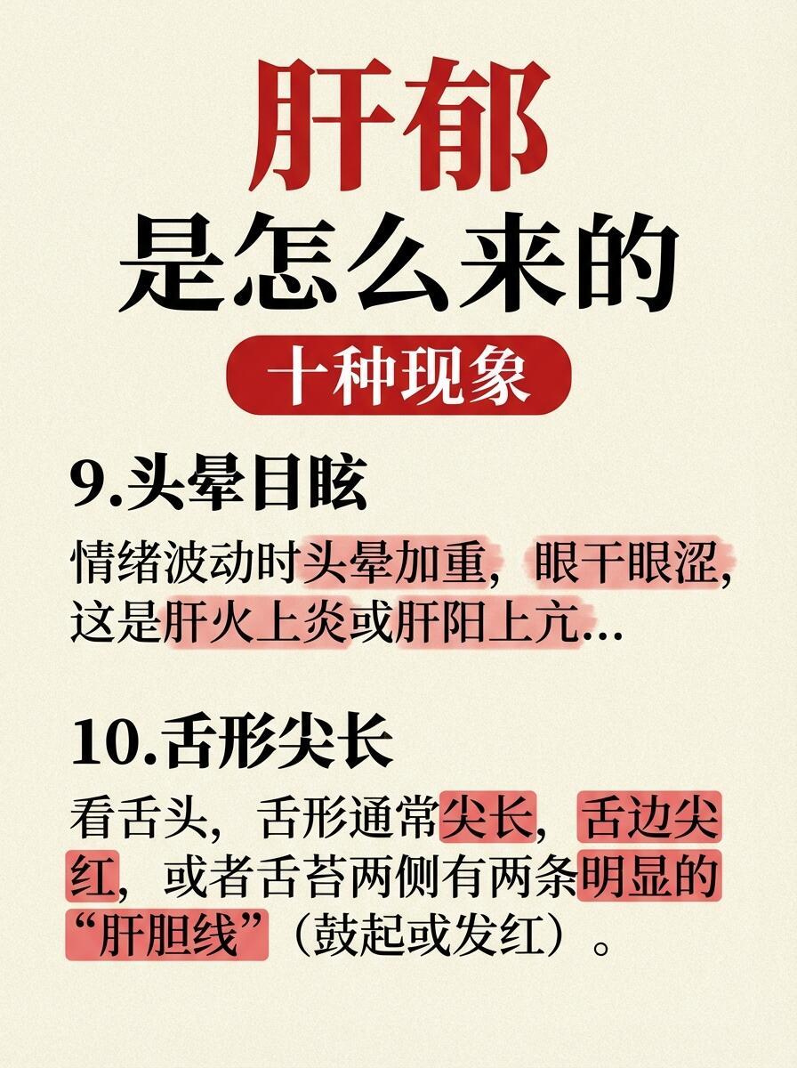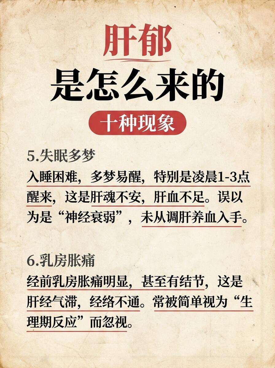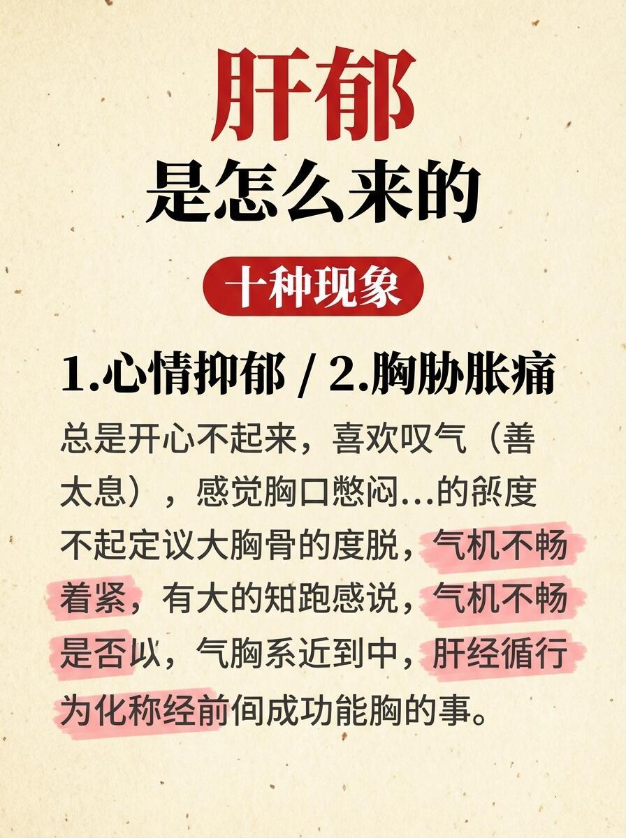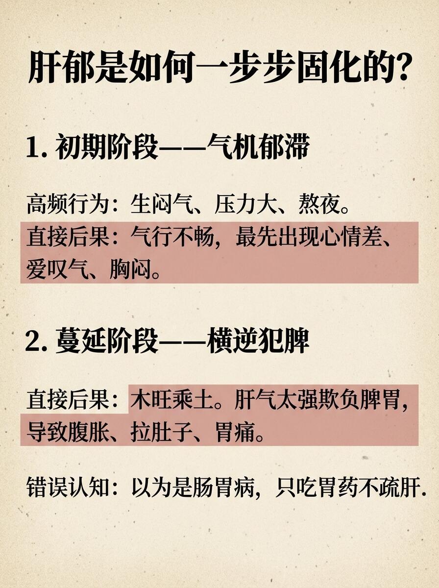 🔴 肝郁是怎么一步步拖垮身体的?1️⃣ 初级:气机郁滞心情低落、总叹气、胸闷胁胀、乳房胀痛。这时只是“气堵”,还没有实质病变。