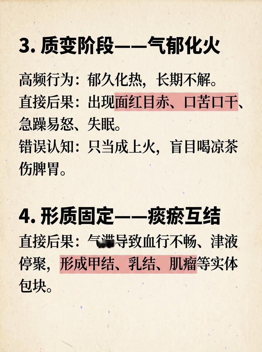 3️⃣ 质变:化火生结郁久化火,变得急躁易怒、失眠多梦、头晕上火;气滞日久,痰瘀互结,容易形成甲状腺结节、乳腺结节、子宫肌瘤等问题。