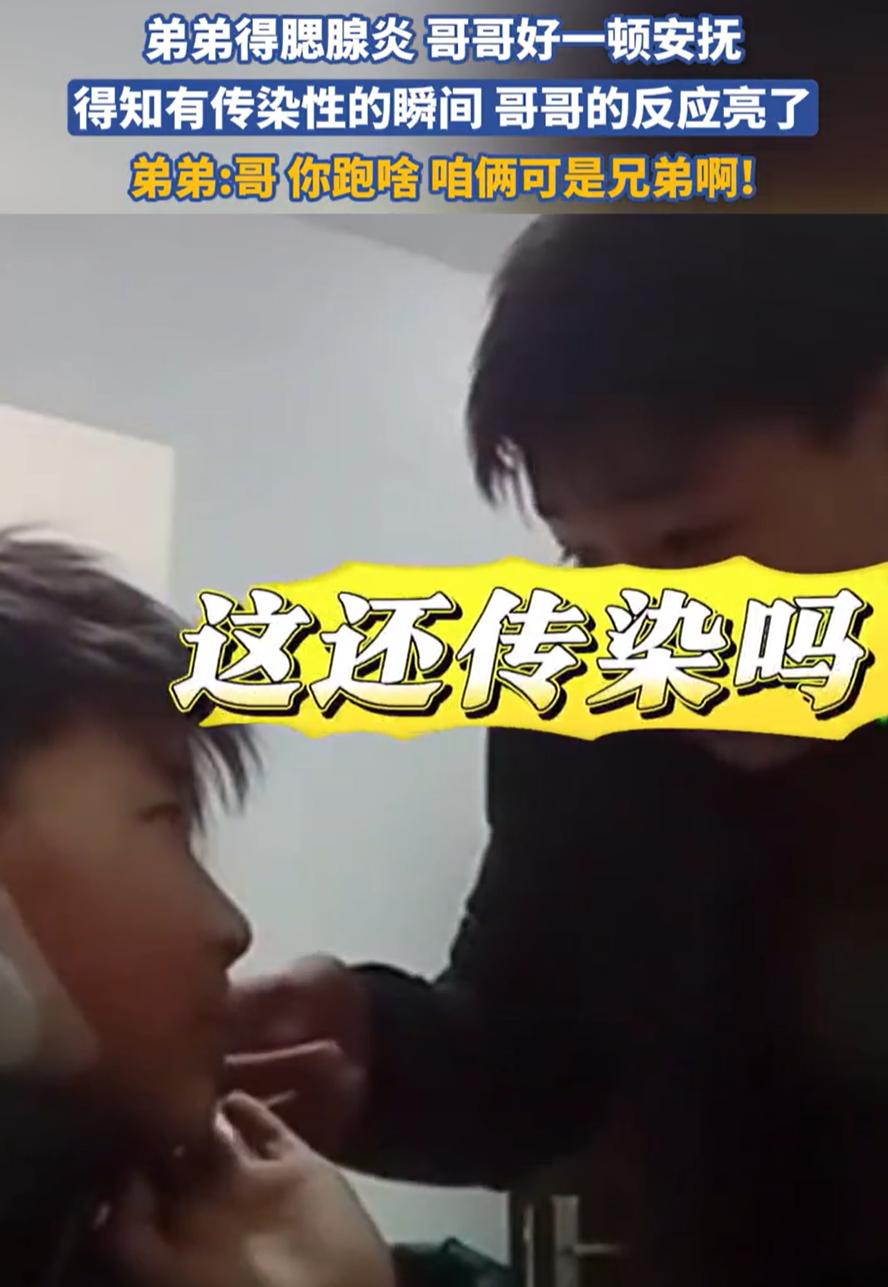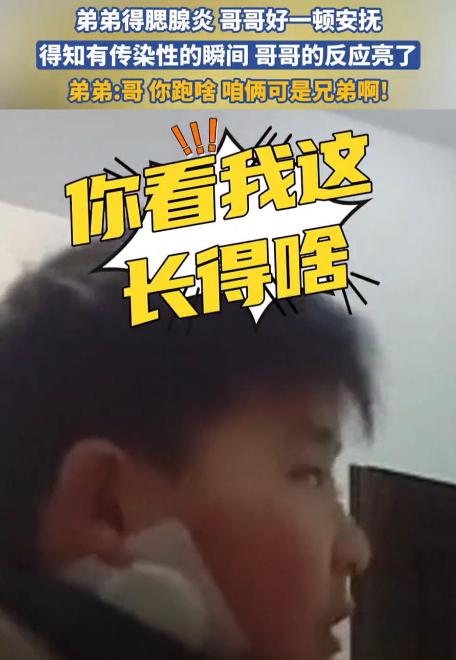 笑不活了!云南,一男孩得了腮腺炎,经过处理后回家找哥哥安慰,哥哥上前一顿安抚,结果得知弟弟是被人传染的,哥哥立刻变脸,转身离开没有一丝犹豫,网友:前一秒兄弟情深,后一秒一点不装 当时,弟弟得了腮腺炎,脸肿得像个小包子。经过一番处理后,弟弟觉得实在憋得难受,便找到哥哥,想让哥哥安慰安慰他,顺便看看自己的“战果” 弟弟把哥哥喊过来,声音软塌塌的:哥,你瞅瞅我这是长的啥?哥哥本来在忙自己的,听到这声儿一扭头,走近一看,好家伙,纱布裹得严严实实,好奇的询问:我靠,你这啥玩意儿啊? 弟弟随口答了一句:炸菜 这词儿接地气,家里人都懂,就是腮腺炎,小时候谁班上没停过几天课。哥哥还伸手想看看严不严重,左瞅右瞅,还挺认真。接着问了一句,这咋整的? 弟弟说是被别人传的,哥哥立刻反应过来,这东西传染啊?哥哥前一秒还凑在弟弟跟前,眼神里透着心疼,下一秒确认了会传染,整个人像被按了开关似的,腾地站起来,转身,走人,头都没回,一秒钟都没耽搁 有网友说:前一秒兄弟情深,后一秒听到传染直接变脸,这反应太真实了,一点不装。 弟弟:哥,你这脸变的有点快了啊… 哥哥:爱归爱,命要紧! 其实仔细想想,这根本不是兄弟感情浅,恰恰是因为太熟了,熟到不需要演 真正的家人就是这样,你难受的时候他愿意凑近,你有事的时候他愿意管,但你也得理解,他也有自己的本能反应。腮腺炎这东西,成年人了谁不知道传染性有多强。他跑不是因为不心疼,而是知道你已经看完医生、处理好了,剩下的只是养着,而他这个当哥的,没必要把自己也搭进去