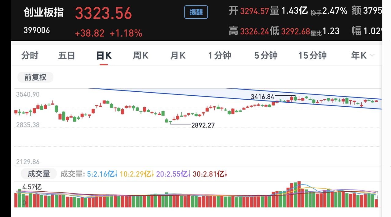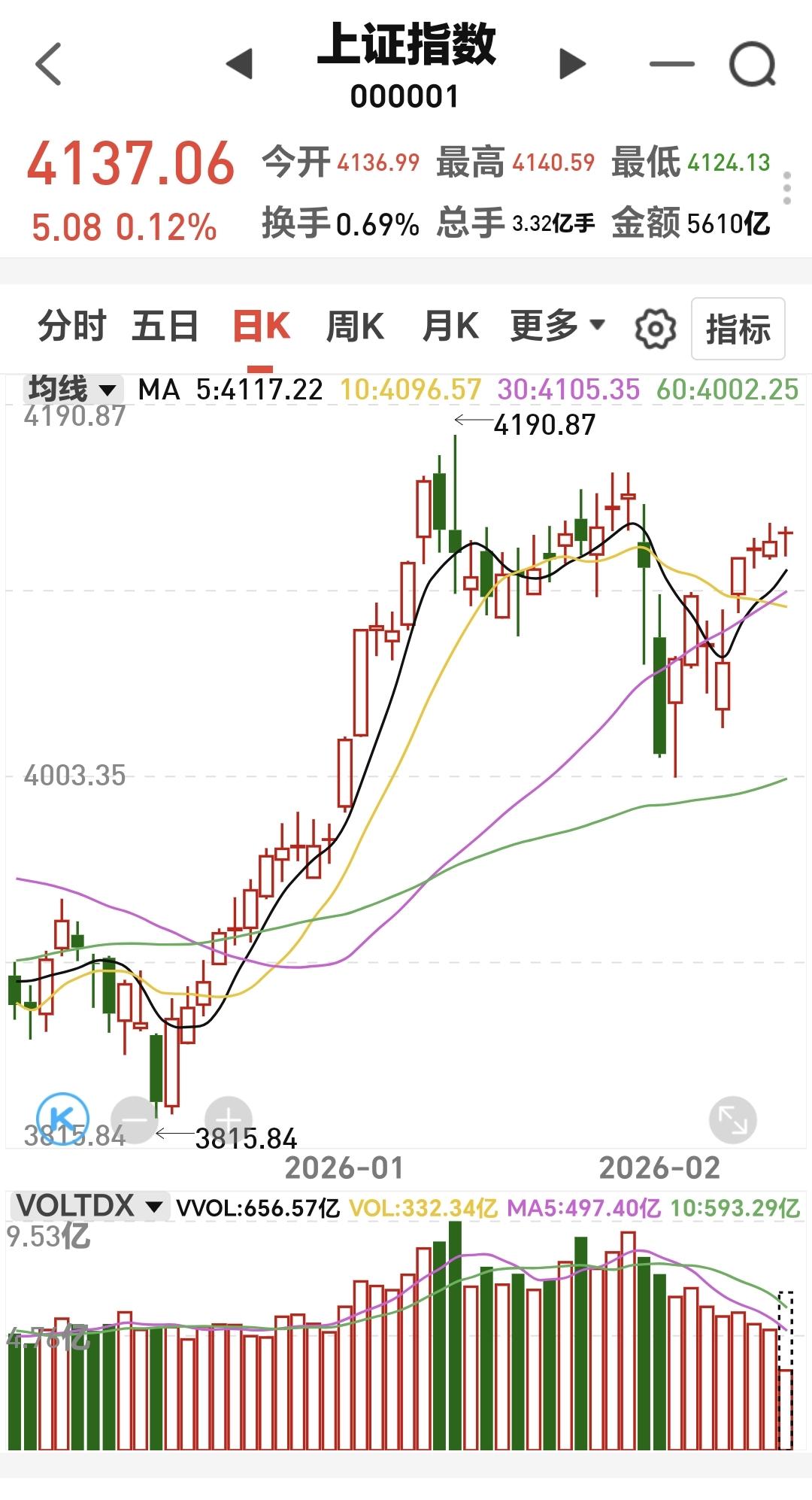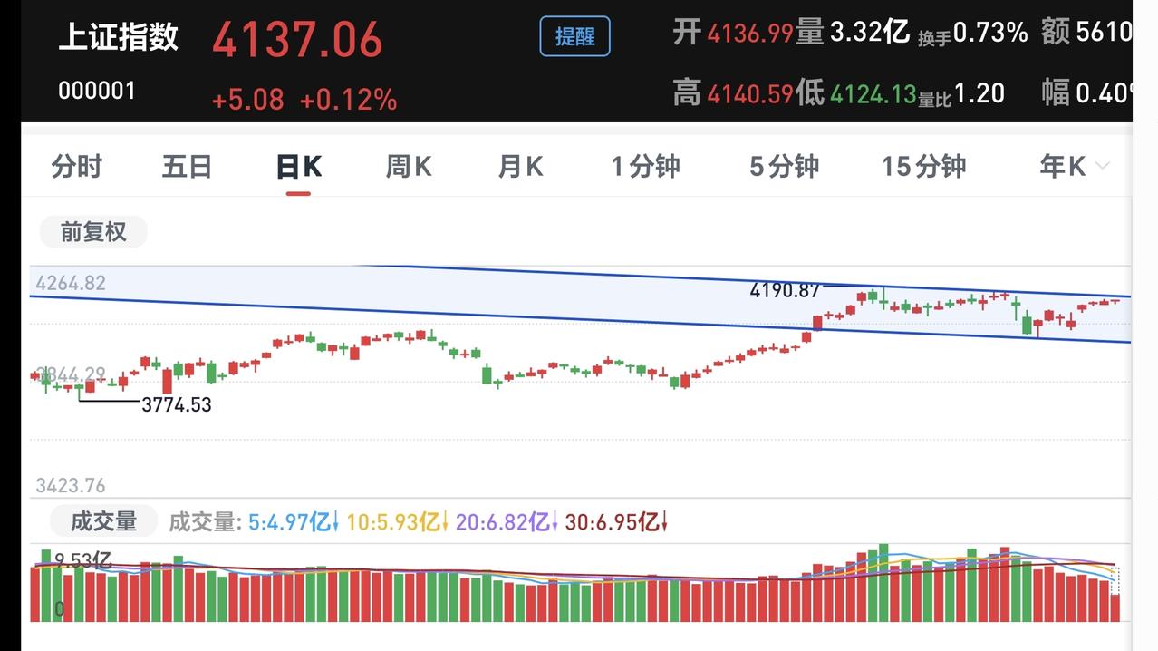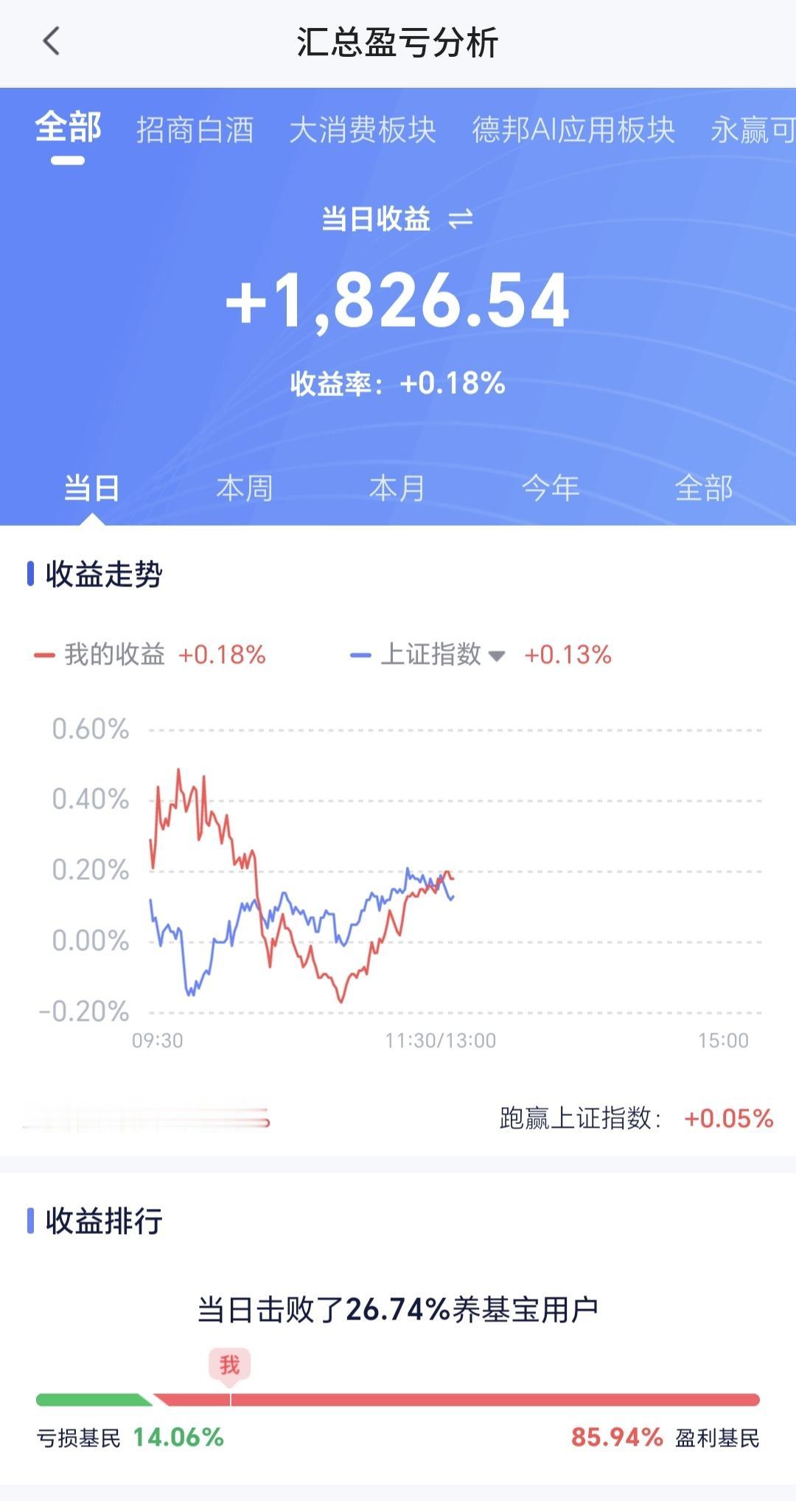 基金:今天收到了市场的春节红包 今天上午就是一个无聊的走势,盘中的波动幅度非常小,最高4140点,最低4124点,波动幅度只有16个点,低于昨天的波动幅度,中午收盘的时候,创业板指上涨了1.18%,收于3323点,上证指数上涨了0.12%,收于4137点。 今天上午黄色线大逆转,早上开盘以后黄色线在蓝色线下方,两条线之间的敞口非常大,中午收盘之前黄色线来到了蓝色线的上方,两条线之间的敞口还可以,只要下午黄色线不再发生逆转,就不要担心今天下午会有大幅度下跌。 两市累计成交13295亿,相比于昨天放量了2%,上涨2700多家,下跌2600多家,上涨家数略微超过了下跌家数,涨停58家,跌停15家,主力资金净流出35亿。 主力资金净流入最多的三个板块是:高端制造板块,新能源板块,机械设备板块,主力资金净流出最多的三个板块是:传媒板块,大金融板块,基本面板块。 持有的基金中,中午收盘的时候估值上涨了1826元,盈利金额最大的三个板块是:创业板指,5G板块,芯片半导体板块,亏损金额最大的三个板块是:白酒板块,创新药板块,证券板块。 上涨幅度最大的三个板块是:电网设备板块,cpo板块,稀土永磁板块,下跌幅度最大的三个板块是:恒生科技板块,传媒游戏板块,白酒板块。 Cpo板块今天大涨,这个板块现在日线级别处于上涨通道中,只要能够保持在这个上涨通道下轨线的上方,短线持有的人就可以继续持有。 CPO板块周线级别也是处于上涨通道中,而且处于上涨通道中间的位置,短期的涨跌都不会影响这个板块周线级别的上涨趋势,不会影响这个板块的大方向向上,长线持有的人可以继续持有,只有下跌跌破上涨通道下轨线的时候,才可以考虑要不要止盈出来观望。 稀土永磁板块周线级别也是处于上涨通道中,长线持有的人可以继续持有,周线级别上涨通道的下轨线是长线持有者的持有条件。只要保持在这条线之上,就可以继续持有,只有跌破了这条线,才可以考虑要不要止盈出来观望。 中午收盘的时候,创业板指和上证指数都是上涨的,我们再来看一下这两个指数日线级别的情况,这两个指数都是处于日线级别短期下跌通道中,都是距离日线级别短期下跌通道的上轨线比较近,也就是说距离上方的压力位置很近,再继续向上上涨一点点就会到达压力位置,只有以中大阳线突破这个下跌通道上轨线,才能考虑可不可以重新进场看多做多,上证指数的压力位置是4155点,这个点位就是上证指数突破日线级别短期下跌通道上轨线的位置,看下面的截图16。 今天上午收益1826元,这是市场给我的春节红包,如果下午再给我一个1826元红包,今天的收益就是3652元,你估计下午会不会还有这么多的红包? 点赞和评论是你的美德,点赞和评论是对我的肯定,点赞和评论是对我的支持,很多人看了以后,连1秒钟的点赞都不愿意,更不要说让他花30秒钟评论一下,点赞会让你快乐,评论会让你发财。