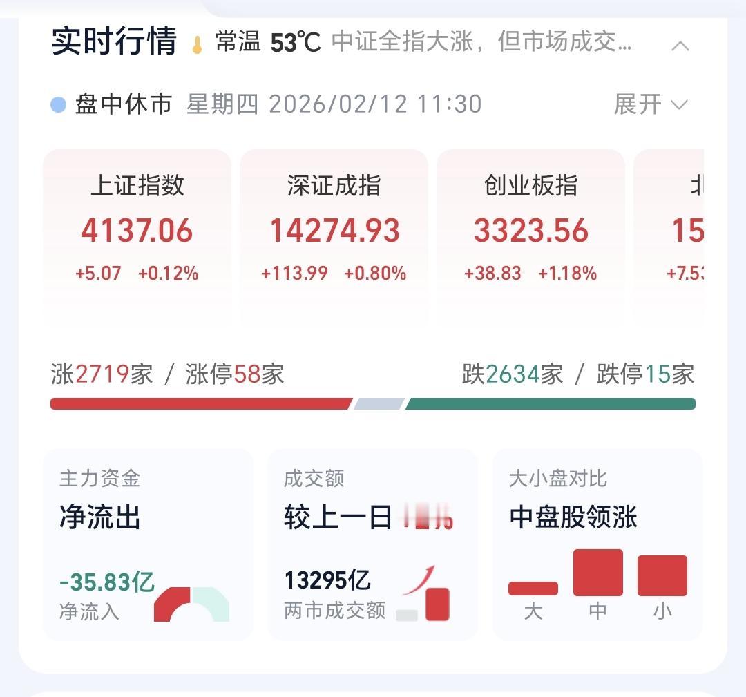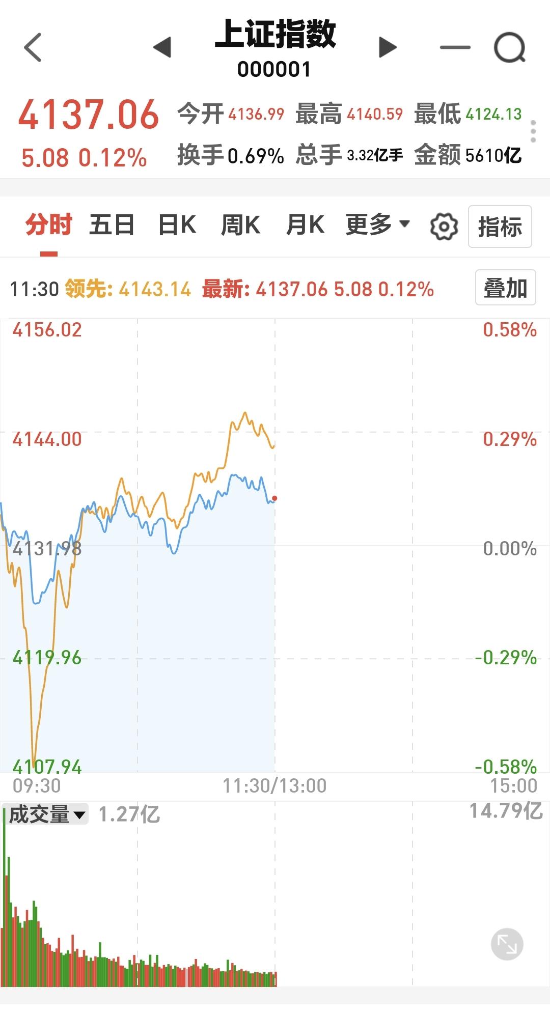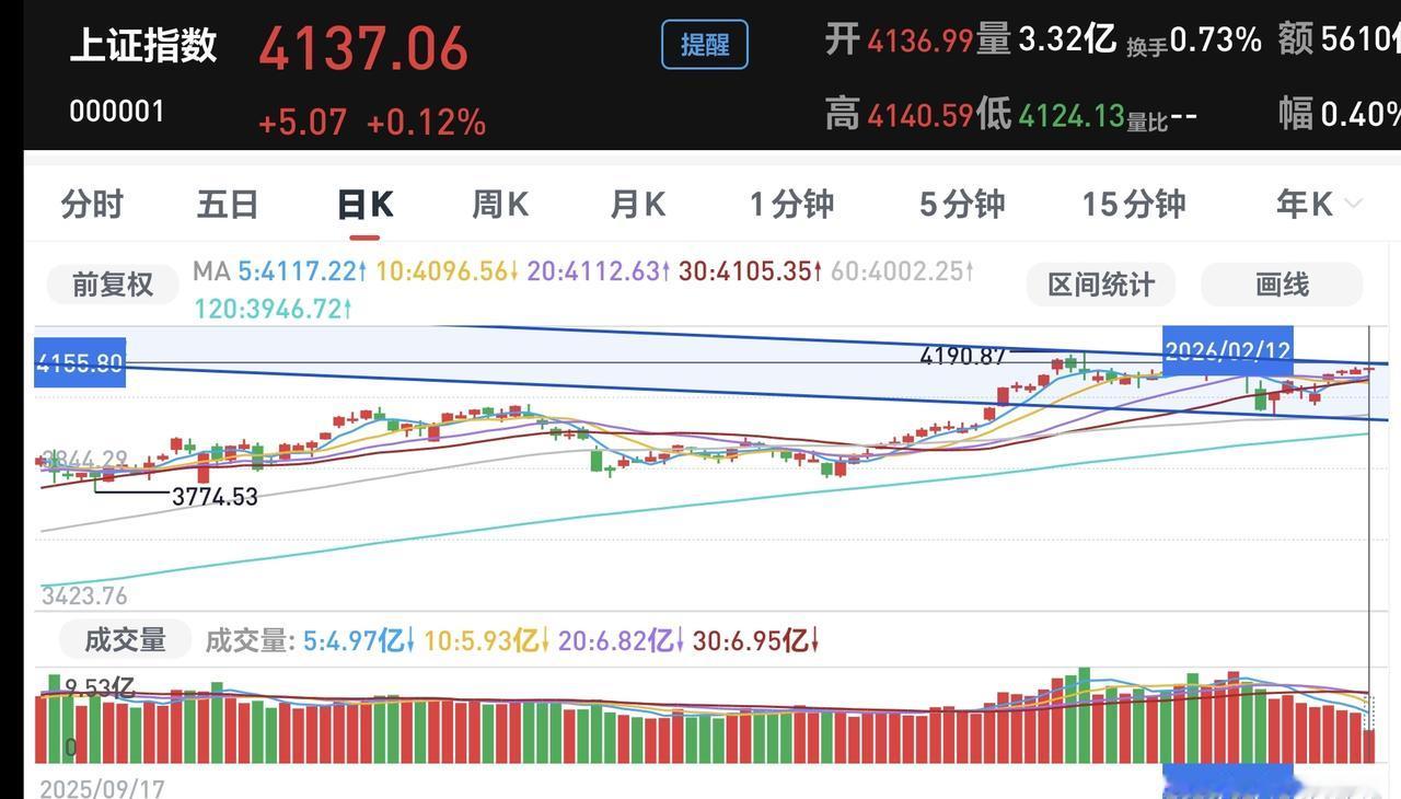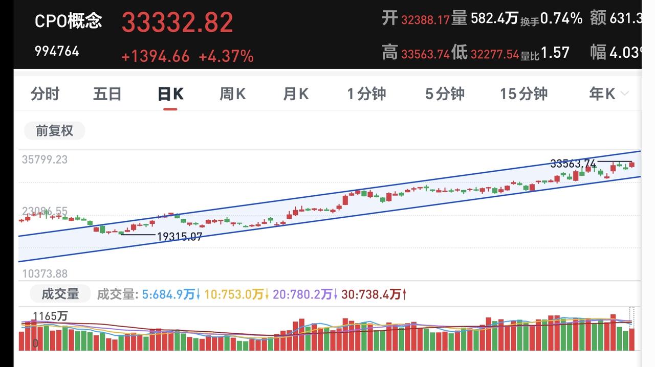 基金:今天收到了市场的春节红包 今天上午就是一个无聊的走势,盘中的波动幅度非常小,最高4140点,最低4124点,波动幅度只有16个点,低于昨天的波动幅度,中午收盘的时候,创业板指上涨了1.18%,收于3323点,上证指数上涨了0.12%,收于4137点。 今天上午黄色线大逆转,早上开盘以后黄色线在蓝色线下方,两条线之间的敞口非常大,中午收盘之前黄色线来到了蓝色线的上方,两条线之间的敞口还可以,只要下午黄色线不再发生逆转,就不要担心今天下午会有大幅度下跌。 两市累计成交13295亿,相比于昨天放量了2%,上涨2700多家,下跌2600多家,上涨家数略微超过了下跌家数,涨停58家,跌停15家,主力资金净流出35亿。 主力资金净流入最多的三个板块是:高端制造板块,新能源板块,机械设备板块,主力资金净流出最多的三个板块是:传媒板块,大金融板块,基本面板块。 持有的基金中,中午收盘的时候估值上涨了1826元,盈利金额最大的三个板块是:创业板指,5G板块,芯片半导体板块,亏损金额最大的三个板块是:白酒板块,创新药板块,证券板块。 上涨幅度最大的三个板块是:电网设备板块,cpo板块,稀土永磁板块,下跌幅度最大的三个板块是:恒生科技板块,传媒游戏板块,白酒板块。 Cpo板块今天大涨,这个板块现在日线级别处于上涨通道中,只要能够保持在这个上涨通道下轨线的上方,短线持有的人就可以继续持有。 CPO板块周线级别也是处于上涨通道中,而且处于上涨通道中间的位置,短期的涨跌都不会影响这个板块周线级别的上涨趋势,不会影响这个板块的大方向向上,长线持有的人可以继续持有,只有下跌跌破上涨通道下轨线的时候,才可以考虑要不要止盈出来观望。 稀土永磁板块周线级别也是处于上涨通道中,长线持有的人可以继续持有,周线级别上涨通道的下轨线是长线持有者的持有条件。只要保持在这条线之上,就可以继续持有,只有跌破了这条线,才可以考虑要不要止盈出来观望。 中午收盘的时候,创业板指和上证指数都是上涨的,我们再来看一下这两个指数日线级别的情况,这两个指数都是处于日线级别短期下跌通道中,都是距离日线级别短期下跌通道的上轨线比较近,也就是说距离上方的压力位置很近,再继续向上上涨一点点就会到达压力位置,只有以中大阳线突破这个下跌通道上轨线,才能考虑可不可以重新进场看多做多,上证指数的压力位置是4155点,这个点位就是上证指数突破日线级别短期下跌通道上轨线的位置,看下面的截图16。 今天上午收益1826元,这是市场给我的春节红包,如果下午再给我一个1826元红包,今天的收益就是3652元,你估计下午会不会还有这么多的红包? 点赞和评论是你的美德,点赞和评论是对我的肯定,点赞和评论是对我的支持,很多人看了以后,连1秒钟的点赞都不愿意,更不要说让他花30秒钟评论一下,点赞会让你快乐,评论会让你发财。