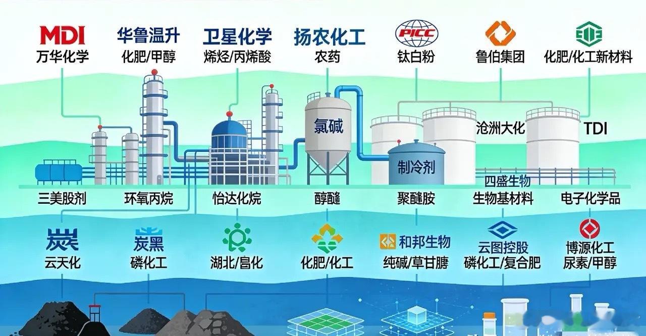 2026年A股化工龙头全景深度分析当前A股化工板块正处于周期底部修复、供给收缩与需求回暖共振的关键窗口。本文覆盖万华化学、华鲁恒升、卫星化学等20家核心标的,从主营业务、产业链关联、发展前景三维度展开原创解析,为把握行业拐点提供清晰框架。一、主营业务与赛道定位聚氨酯与异氰酸酯龙头:万华化学为全球MDI绝对龙头,产能与成本优势显著;沧州大化聚焦TDI,行业格局集中。煤化工与一体化基地:华鲁恒升、鲁西化工、中泰化学、滨化股份依托煤气化与园区一体化,覆盖尿素、醋酸、DMF、PVC等基础品,现金流稳健。轻烃与新材料:卫星化学以乙烷裂解为核心,布局丙烯酸及酯、高分子材料,盈利弹性突出。农药与精细化工:扬农化工为菊酯全球龙头,创制与生物农药布局领先;永东股份主营炭黑与精细化工品。 钛白粉与无机盐:龙佰集团为钛白粉全球龙头,依托资源与规模主导价格修复。氟化工与制冷剂:三美股份受益配额管理与出口回暖,液冷与新能源材料打开成长空间。磷复肥与磷化工:云天化、湖北宜化、和邦生物、云图控股、博源化工,覆盖磷矿、氮肥、复合肥,绑定农业刚需与新能源材料需求。精细化学品与特种材料:怡达股份、江天化学深耕醇醚、高分子新材料;四盛生物、新泽丰聚焦生物基与专用化学品,赛道细分壁垒高。二、核心关联与竞争逻辑产业链高度协同,形成资源—原料—中间体—终端闭环:万华、卫星打通上游原料自给,对冲油价波动;华鲁、鲁西以“一头多线”柔性生产,穿越周期;磷化工、氟化工同时受益农业刚需与新能源、液冷增量;农药、钛白粉、异氰酸酯呈寡头格局,龙头定价权强化。环保与双碳政策加速中小产能出清,一体化、技术、成本三大壁垒成为核心胜负手。三、发展前景与2026年核心驱动周期修复主线:MDI、TDI、钛白粉、PVC、制冷剂等产品价格企稳回升,供给端扩产放缓、海外产能收缩,需求端地产、汽车、出口回暖,龙头盈利弹性最大。 成长转型主线:万华POE、特种聚合物;卫星化学高端聚醚;扬农创制农药;三美氟新材料;磷化工向磷酸铁锂、储能材料延伸,打开估值天花板。成本与壁垒主线:煤价回落利好煤化工;轻烃路线优势延续;园区一体化、绿电绿氢改造提升长期盈利稳定性。中小标的:怡达、江天、四盛生物、新泽丰在细分赛道放量,业绩弹性显著,但需关注产能释放与客户验证节奏。四、风险提示原料价格波动、产品价格战、海外贸易壁垒、环保政策收紧、地产与农业需求不及预期。结尾概述2026年化工行业迎来周期反转+成长突围双击。万华化学、华鲁恒升、卫星化学、扬农化工、龙佰集团等龙头凭借一体化、技术与规模优势,确定性最强;云天化、湖北宜化、三美股份等兼具周期弹性与成长属性;细分小市值标的则聚焦赛道放量机会。整体看,板块估值处于历史低位,盈利修复与估值抬升空间充足,龙头优先、细分择优是核心配置思路。你觉得哪些A股板块在春节后有潜力股市第一线股市分析分享股市点滴